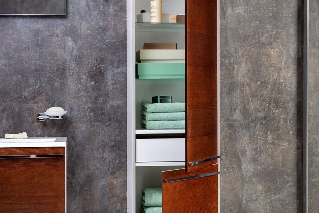 Dvoje dvere vrátane vnútornej zásuvky poskytujú príjemne členitý priestor pre umiestnenie predmetov rôznej veľkosti. Príslušná varianta ľavá / pravá je daná stranou, na ktoré sú pánty. Dvierka sú z pravej jaseňové dyhy v trendovom čerešňovom odtieni alebo v bielom lesku (lakovaná MDF), korpus je biely. Dodávané v zmontovanom stave.