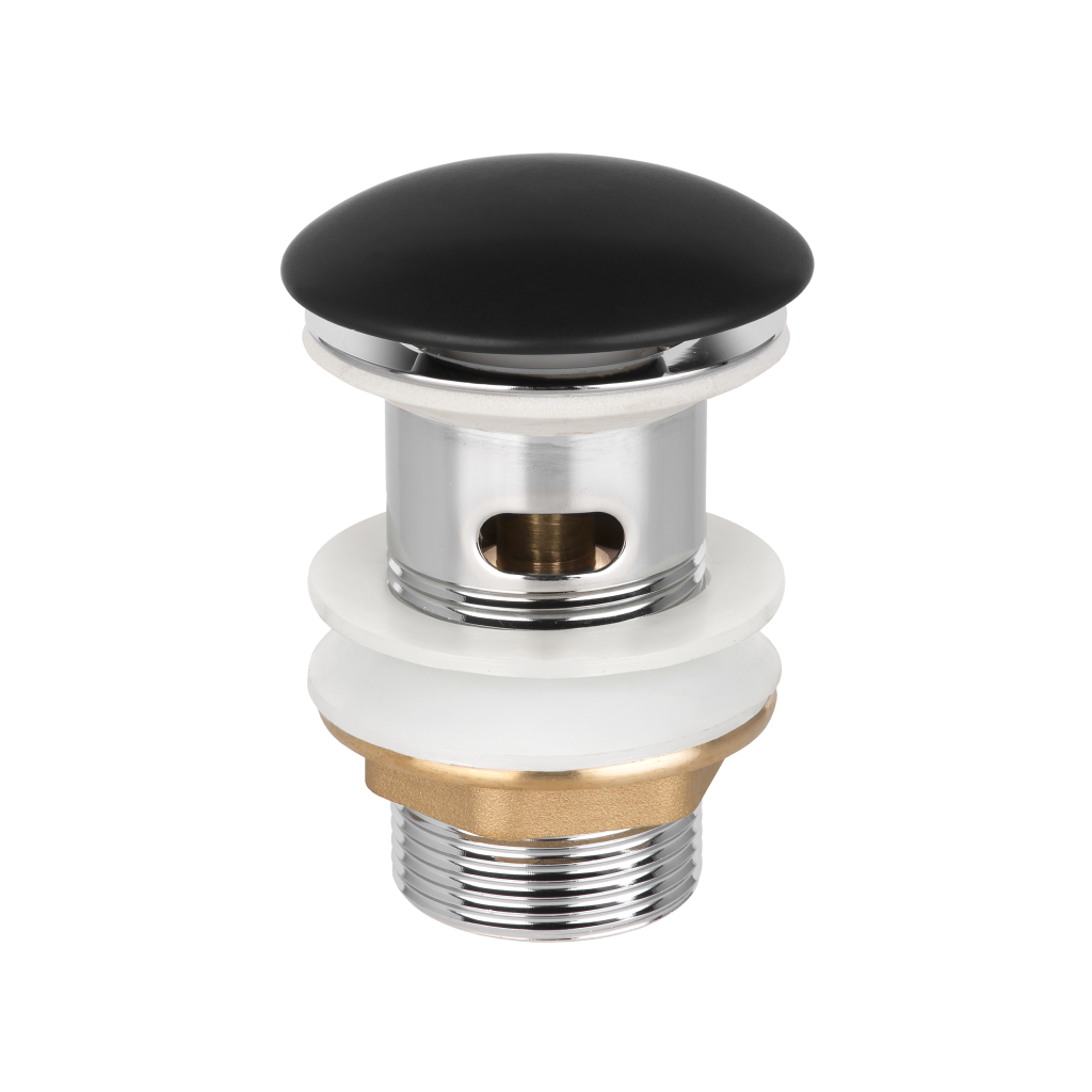 Umývadlová mosadzná zátka klik-klak /uzatváranie a otváranie pomocou stlačenia hornej zátky/ s keramickým vrškom pre umývadlá s prepadom . Je určená na zakrytie umývadlového odpadu.