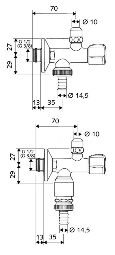 Rohový ventil so zabudovaným prístrojovým ventilom na pripojenie k domácemu spotrebiču. Ovládanie rohového ventilu pod krytkou