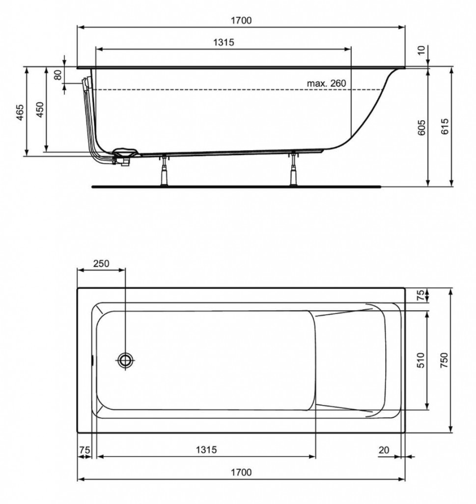 Nožičky a odtoková súprava nie sú súčasťou dodávky.