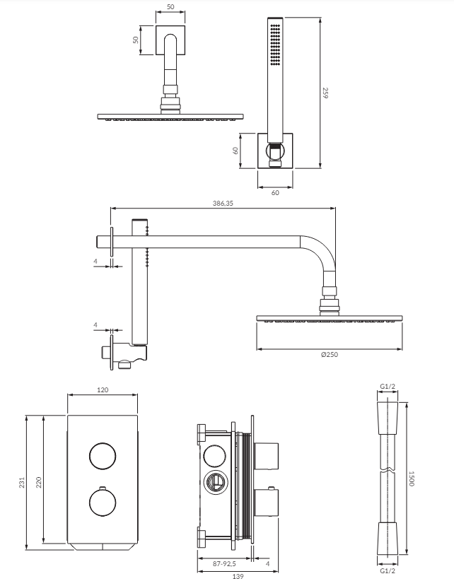 - termostatická podomietková sprchová a vaňová batéria ( CT8036CPB )), rozmer rozety: 12 x 22 cm, minimálna inštalačná hĺbka: 8,5 cm, dva vstupy (pre teplú a studenú vodu): 3/4", dva výstupy zmiešanej vody: 1/ 2", súčasťou je zapustený prvok