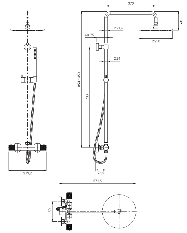- mosadzná hlavová sprcha, rozmer: ø25 cm, dosah od steny: 44,5 cm