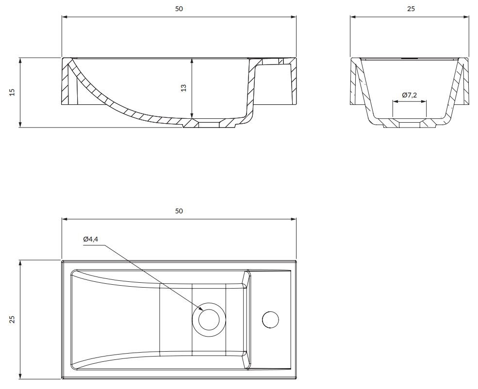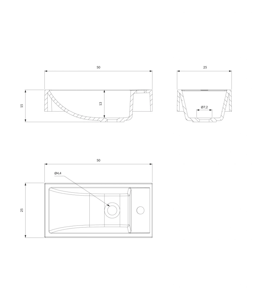 Samotné umývadlo je dlhé 50 cm a hlboké 25 cm . Umývadlo nemá bezpečnostný prepad, je potrebné zvoliť vhodnú výpusť. Možno vybrať z univerzálnych výpustí alebo určených pre umývadlá bez prepadu.