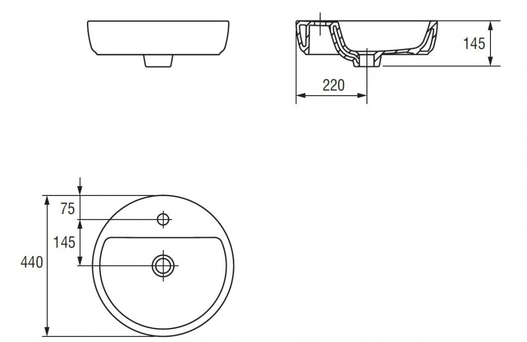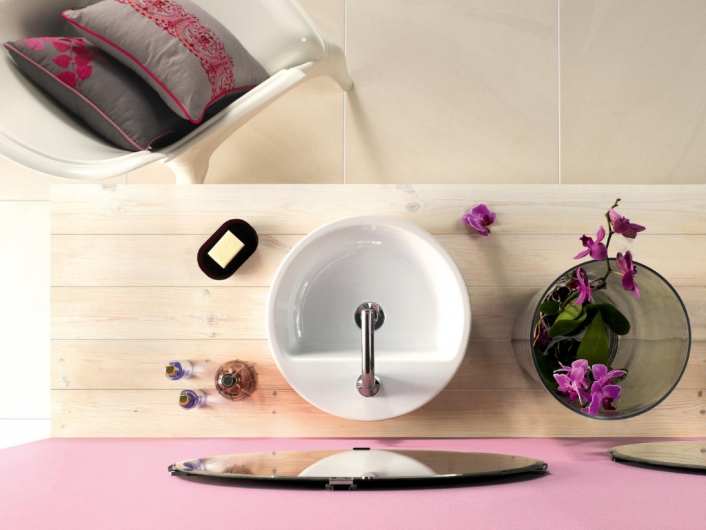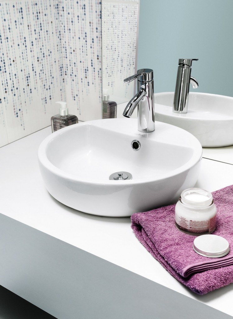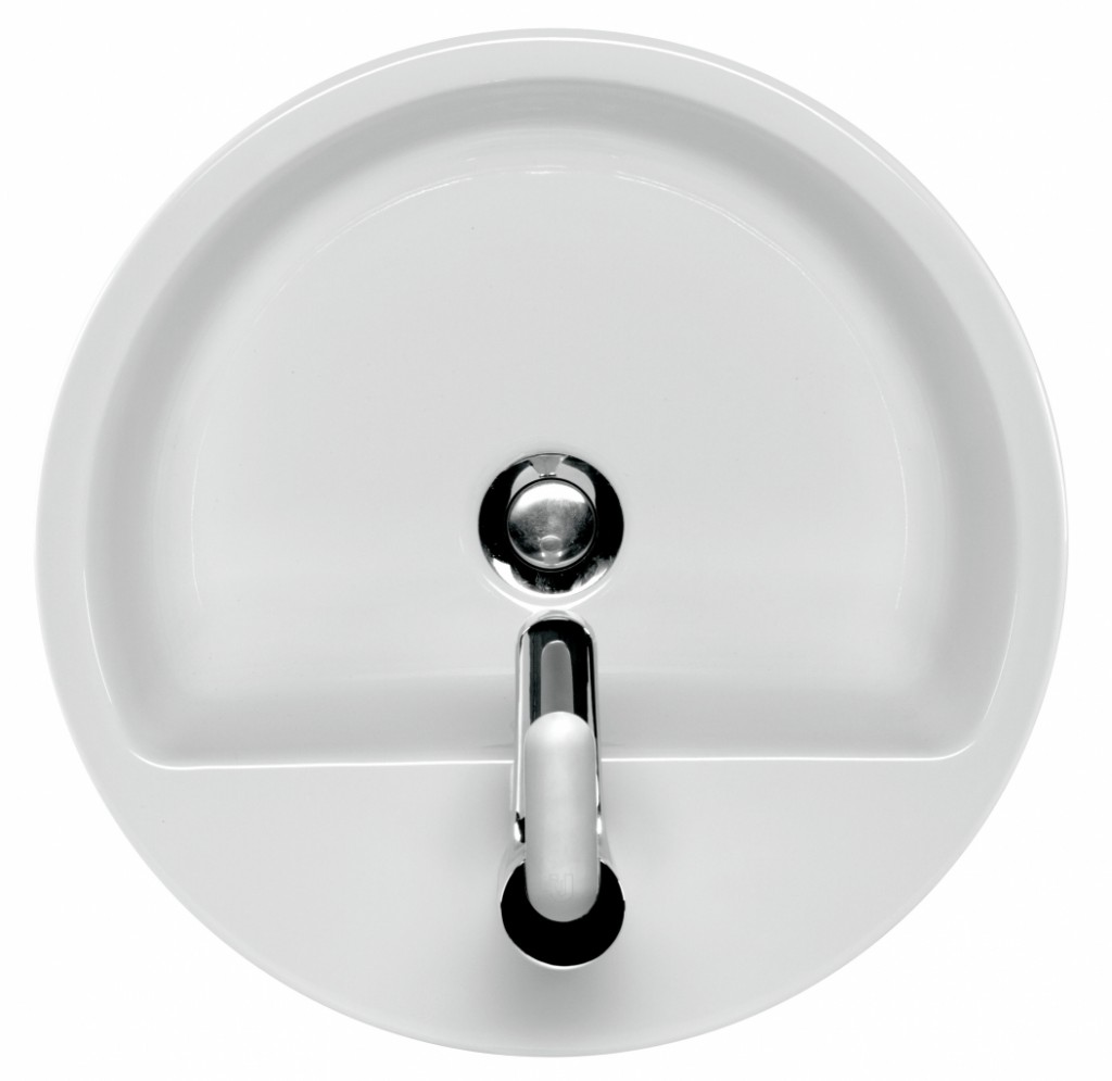 Umývadlo CASPIA RING 44 bielej farby s otvorom pre batériu. Možno umiestniť na dosku alebo inštalovať na skrinku z radu Still. Ideálne riešenie pre malé kúpeľne.