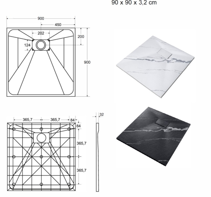 Rozmery a parametre štvorcovej vaničky VEXO MARBLE:- Rozmer: 90 x 90 x 3,2 cm