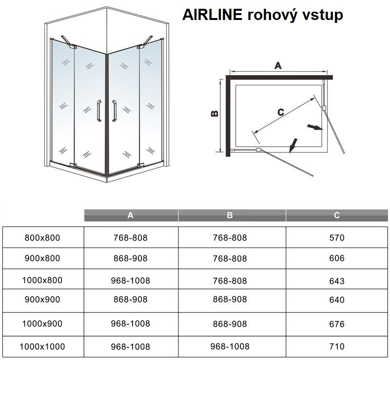 Štvorcový sprchovací kút AIRLINE R101, 100x100 cm, s dvomi jednokrídlovými dverami s pevnou stenou, rohový vstup