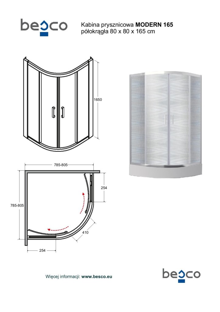 Štvrťkruhový sprchovací kút MODERN 165 vyniká kvalitným spracovaním hliníkového rámu vo farbe lesklého chrómu, ktorý spolu s magnetickým dovieraním zaistí jeho dokonalú tesnosť. Maximálne bezpečie zaistí bezpečnostné sklo (6 mm) a ľahký posun ložiskové pojazdy . Sprchovací kút s výškou 165 cm je vhodný pre neštandardné priestory kúpeľní a pre menšie kúpeľne. Zástena je určená pre vaničky DIPER I a DIPER II, OLIVER I a OLIVER II, SLIVEN.