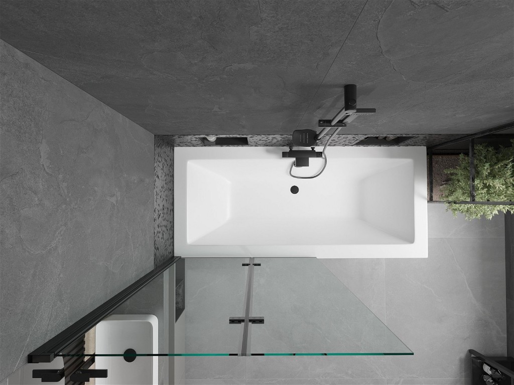 Obdĺžniková, akrylátová vaňa Cube 170 x 80 cm v bielej farbe , doplnená o čelný a bočný panel a vaňovú, dvojkrídlovú zástenu Castor z číreho skla s čiernymi prvkami. Zástena elegantne prilieha k vani a zaisťuje ochranu proti striekajúcej vode pri sprchovaní.