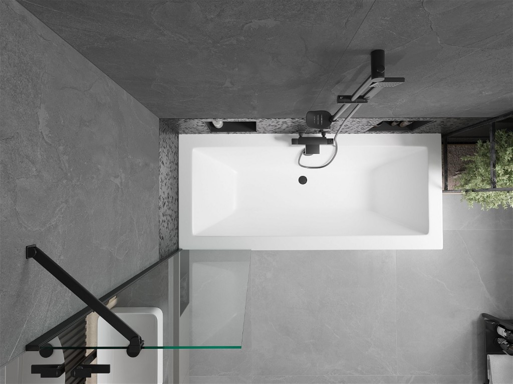 Obdĺžniková, akrylátová vaňa Cube 170 x 80 cm v bielej farbe , doplnená o čelný a bočný panel a vaňovú, pevnú zástenu Next fix z číreho skla s čiernymi prvkami. Zástena elegantne prilieha k vani a zaisťuje ochranu proti striekajúcej vode pri sprchovaní.