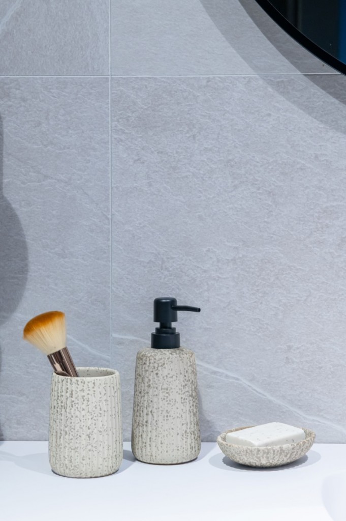 Objavte modernosť a funkčnosť s naším radom Avilla! Náš dávkovač tekutého mydla s objemom 400 ml je dokonalou kombináciou štýlu a praktickosti. Vyrobené z jedinečnej kameniny, s jemným šedým odtieňom a elegantnými hnedými škvrnami, dodá vašej kúpeľni jedinečný charakter. Čierne čerpadlo poskytuje hladkú a presnú dávku mydla a vytvára tak nielen praktický, ale aj krásny prvok vášho okolia.