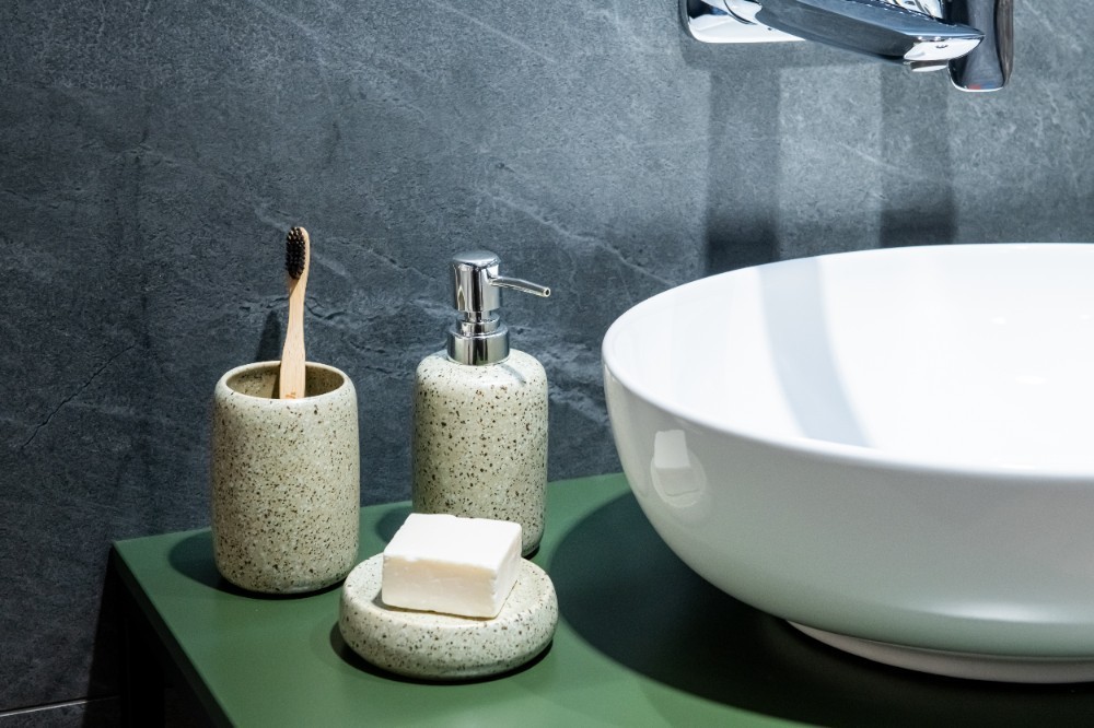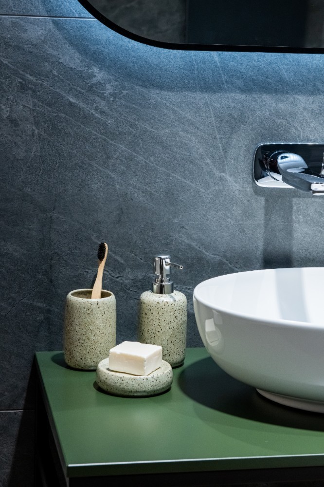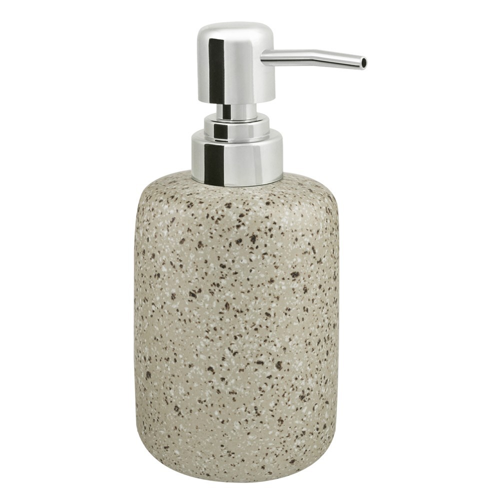 Dávkovač tekutého mydla zo série Hermida v teracovom štýle. Jeho kapacita je 350 ml. Je vyrobená z kameniny s hladkou a na dotyk príjemnou textúrou. Pieskovo béžový dávkovač mydla s bielymi a hnedými škvrnami, ktorý mu dodáva štýl a charakter.