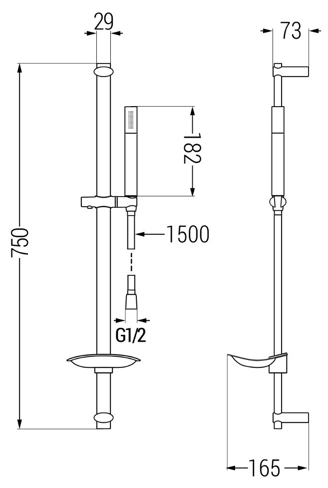 Rozmery držiaka sú: šírka lišty 29 mm, výška 750 mm a hĺbka od steny je 165 mm.