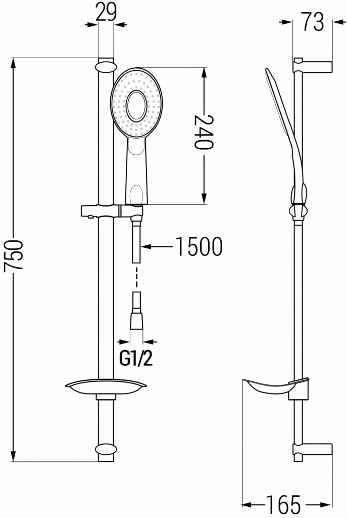 Rozmery držiaka sú: šírka lišty 29 mm, výška 750 mm a hĺbka od steny je 165 mm.