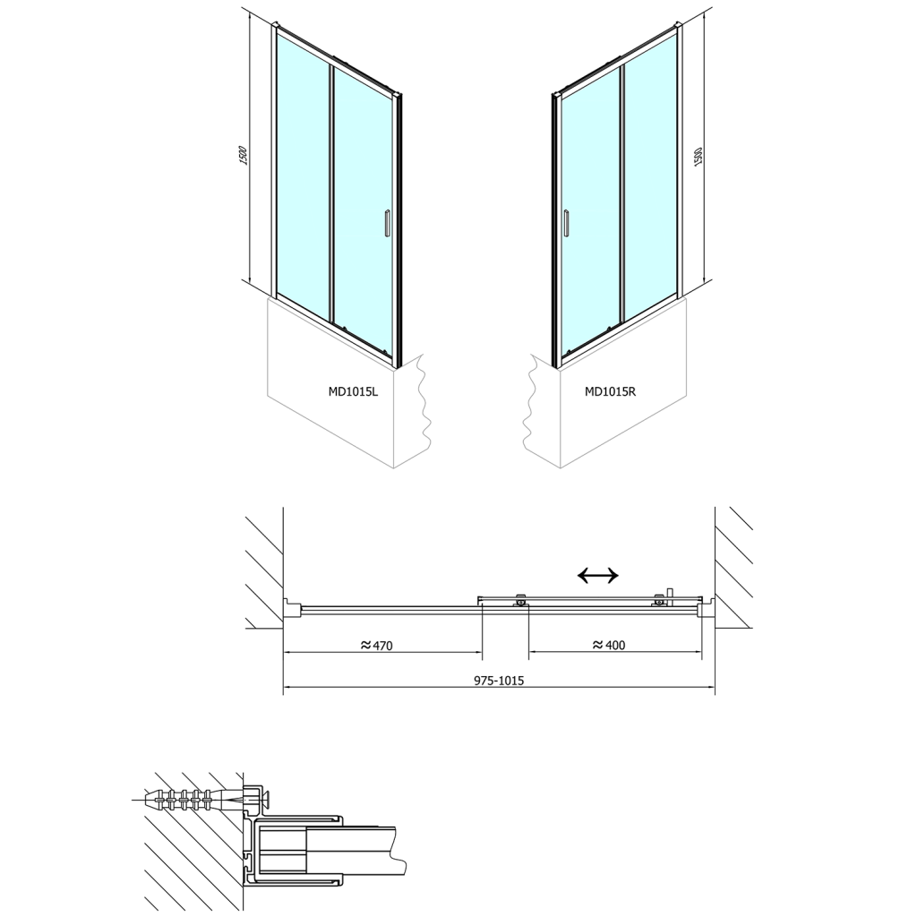 | Prakticky navrhnuté madlo pre pohodlné otváranie dverí | Prípadné nerovnosti steny elegantne skryje profil, do ktorého sa zasúva sklo podľa potreby až 20 mm | Bezproblémový chod a ľahké čistenie posuvných dverí zaisťujú zdvojené výklopné pojazdy |
