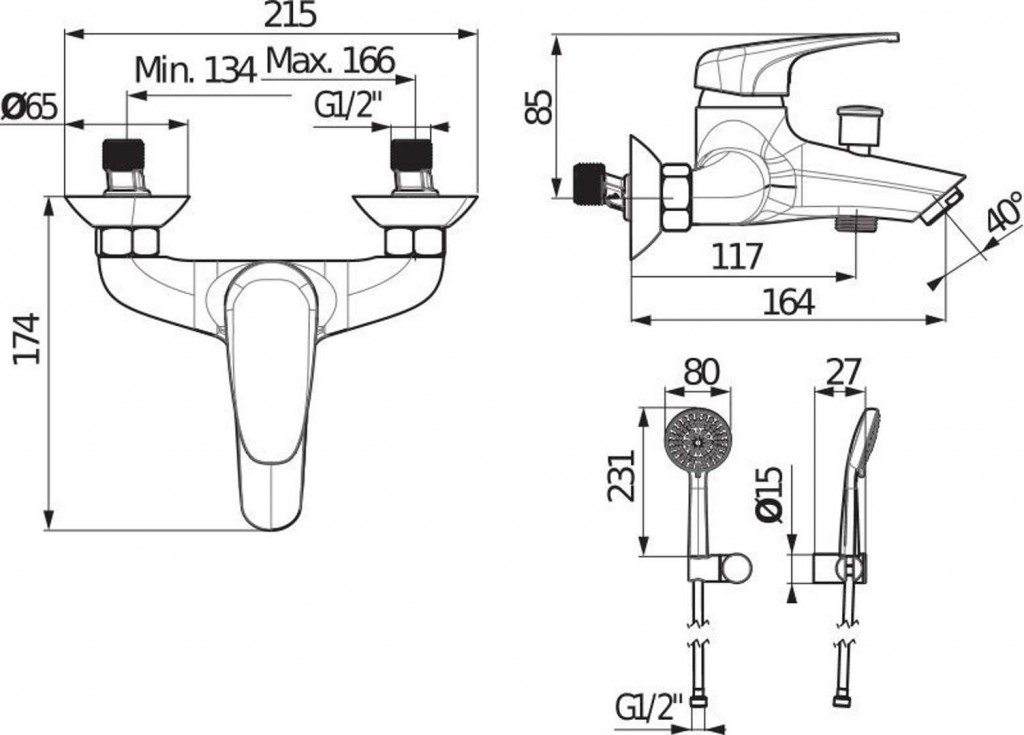 - variant so sprchovacím príslušenstvom (3-funkčná ručná sprcha 80 mm, sprchová hadica 170 cm, držiak)