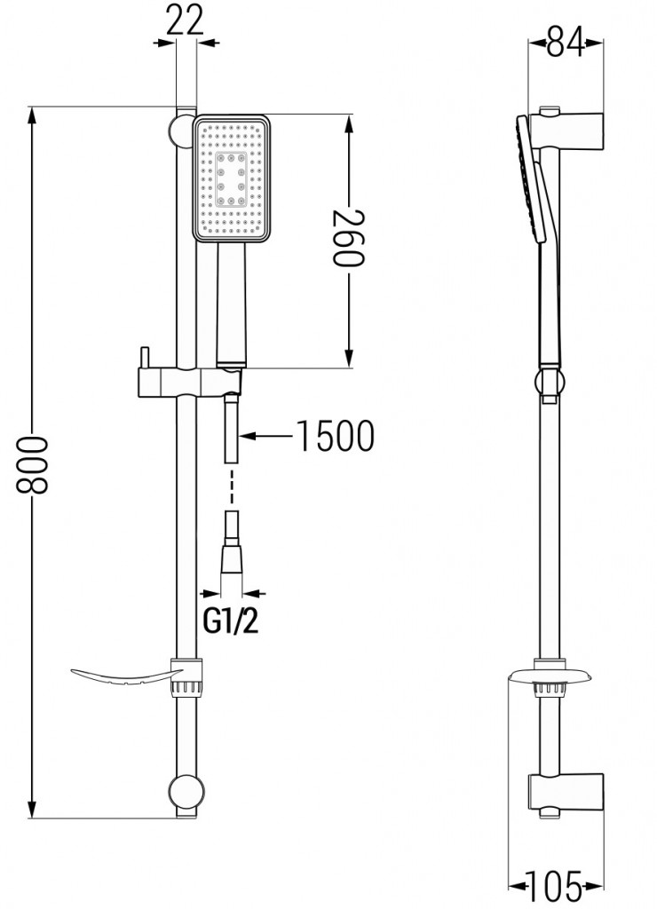 Rozmery držiaka sú: šírka lišty 22 mm, výška 800 mm a hĺbka od steny je 105 mm.