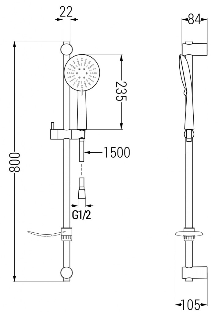 Rozmery držiaka sú: šírka lišty 22 mm, výška 800 mm a hĺbka od steny je 105 mm.