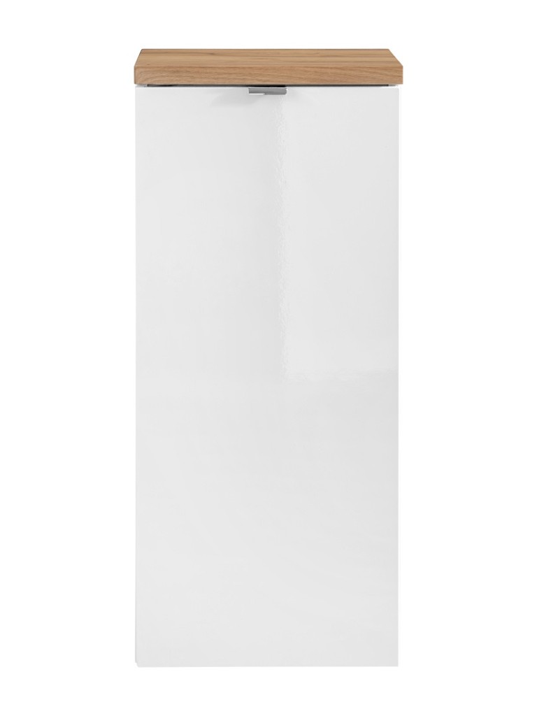 Elegantná spodná skrinka so šírkou 35 cm kombinuje lesklú bielu povrchovú úpravu s dekorom zlatého remeselného duba. Vďaka kompaktným rozmerom sa hodí aj do menších kúpeľní. Vyrobená z kvalitnej MDF dosky s PVC fóliou, ponúka odolnosť voči vlhkosti aj jednoduchú údržbu. Praktické dvierko ukrýva úložný priestor pre každodenné potreby.