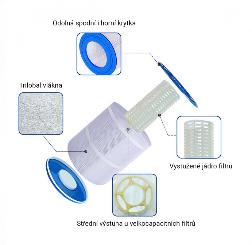 Vystužené koncové kryty sú nielen odolné proti rozbitiu, ale sú veľmi odolné aj voči chemikáliám bežne sa vyskytujúcich v bazénoch a kúpeľoch. Jedinečná štruktúra filtračnej tkaniny uľahčuje zachytenie veľkého objemu nečistôt. Filter je možné ľahko umývať a čistiť . Po vyčistení je filter opäť ako nový a pripravený na ďalšie použitie.