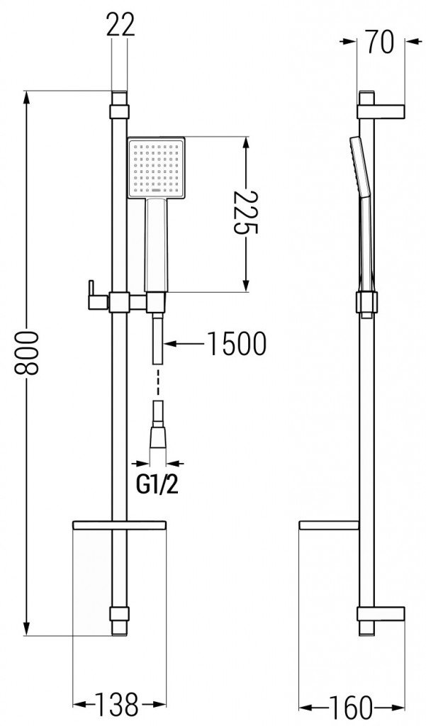 Rozmery držiaka sú: šírka lišty 22 mm, výška 800 mm a hĺbka od steny je 160 mm.