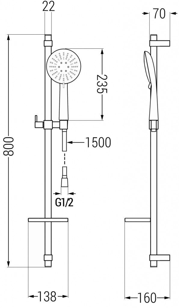 Rozmery držiaka sú: šírka lišty 22 mm, výška 800 mm a hĺbka od steny je 160 mm.