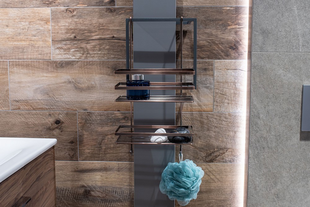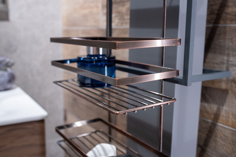 Kúpeľňová polička visiaca nad sprchovacím kútom v antickej medenej farbe. Je to zlato lakovaná oceľ s dlhoročným efektom, ideálna do vintage alebo retro kúpeľne. Horné a spodné háčiky kúpeľňovej police sú chránené plastovými krytmi.
