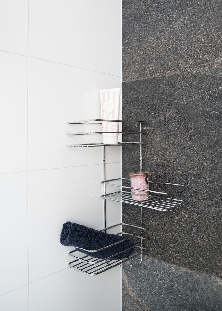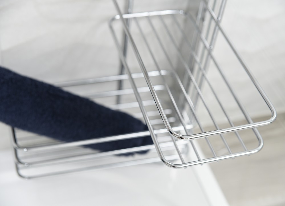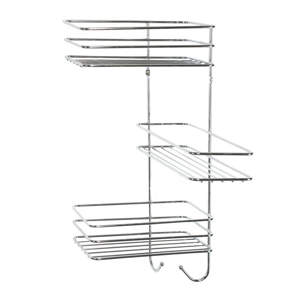 Rohová, trojúrovňová polica z chrómovaného drôtu. V spodnej časti sú dva háčiky na zavesenie uterákov. Skrutky a hmoždinky na montáž sú súčasťou sady.