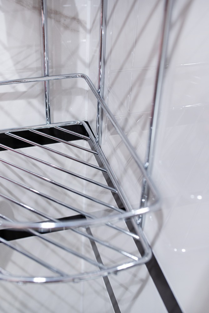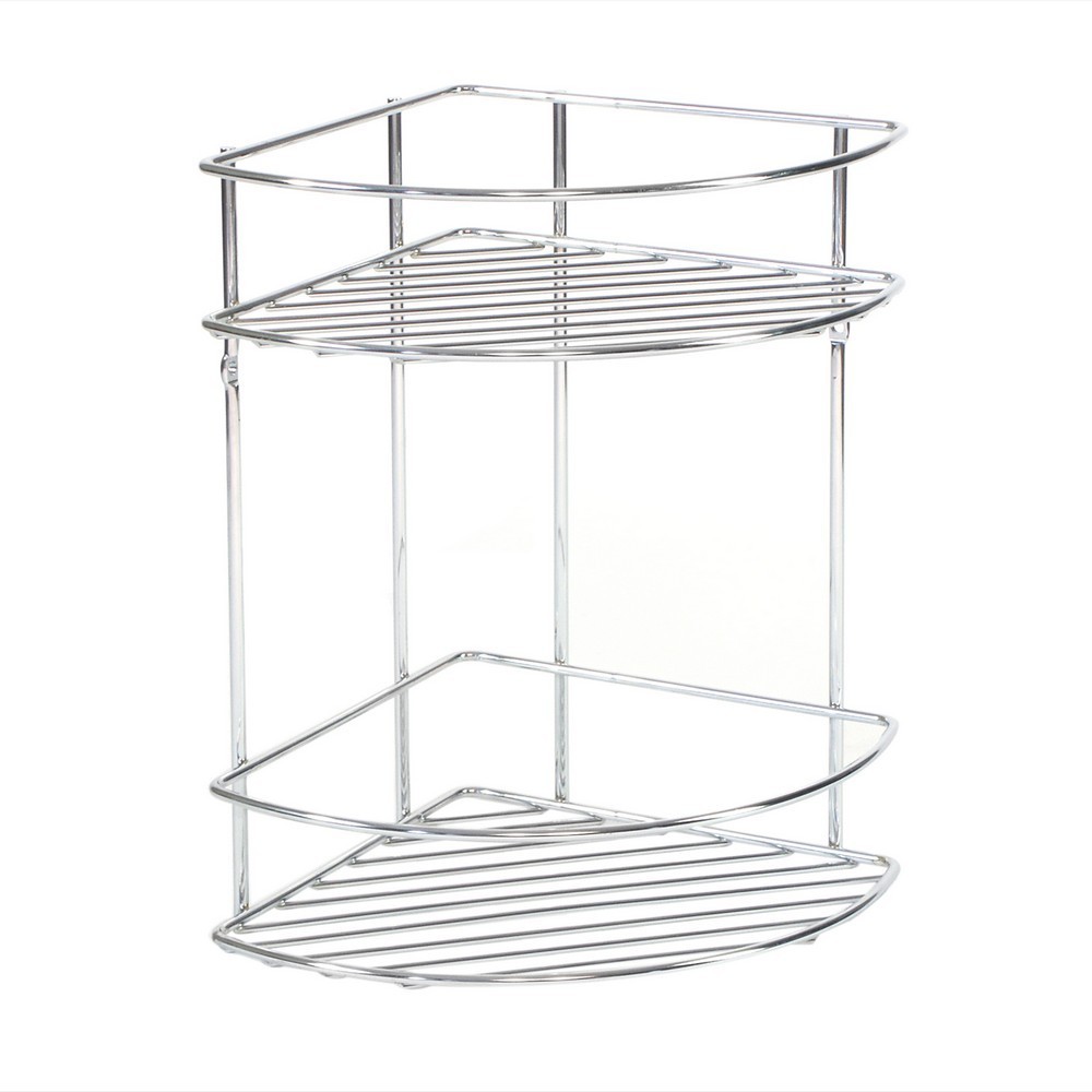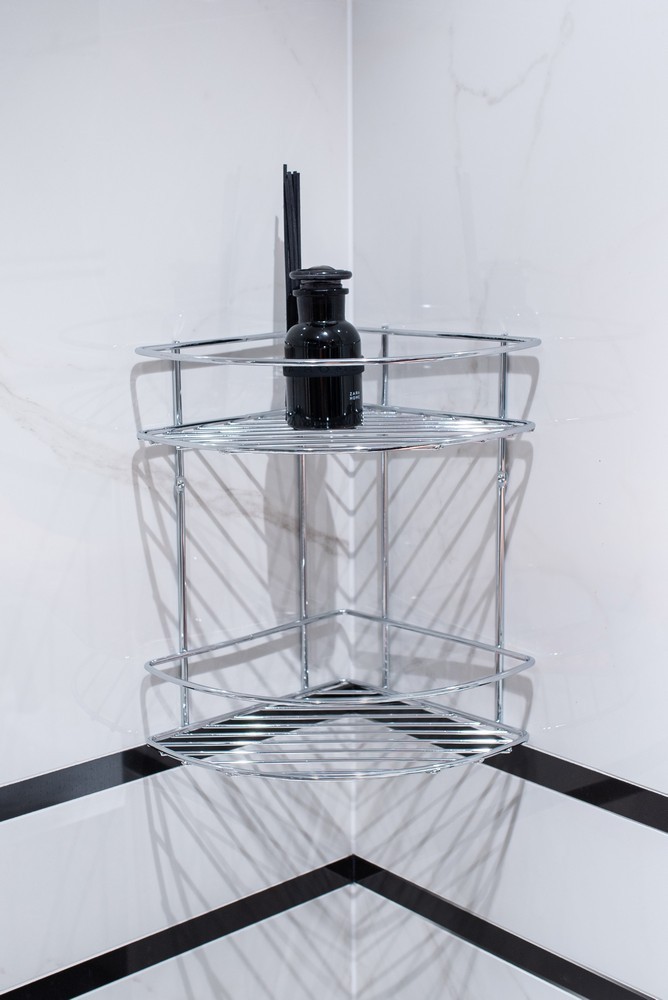 Dvojitá rohová nástenná polica z chrómovaného drôtu. Má dve 1/4 kruhové police. Skrutky a hmoždinky na montáž sú súčasťou sady.