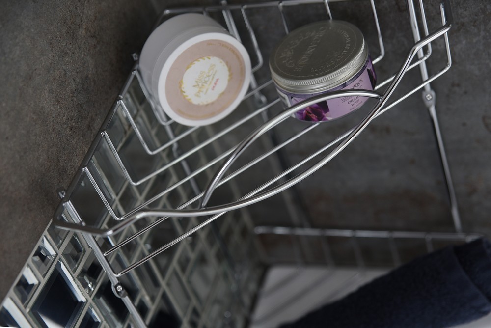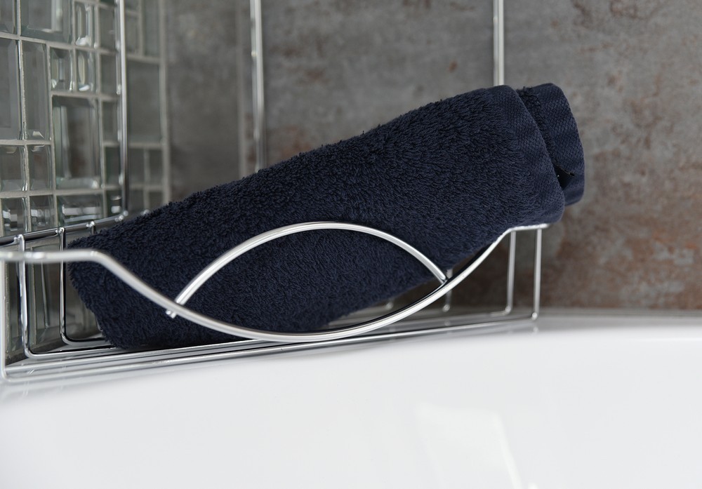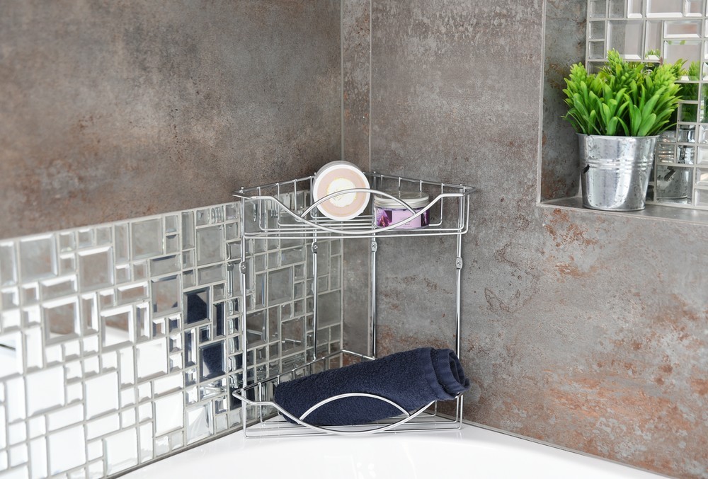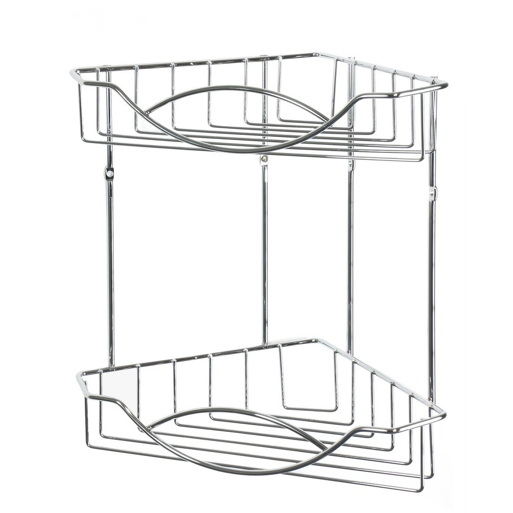 Dvojitá rohová nástenná polica z chrómovaného drôtu. Má dve trojuholníkové police. Skrutky a hmoždinky na montáž sú súčasťou sady.