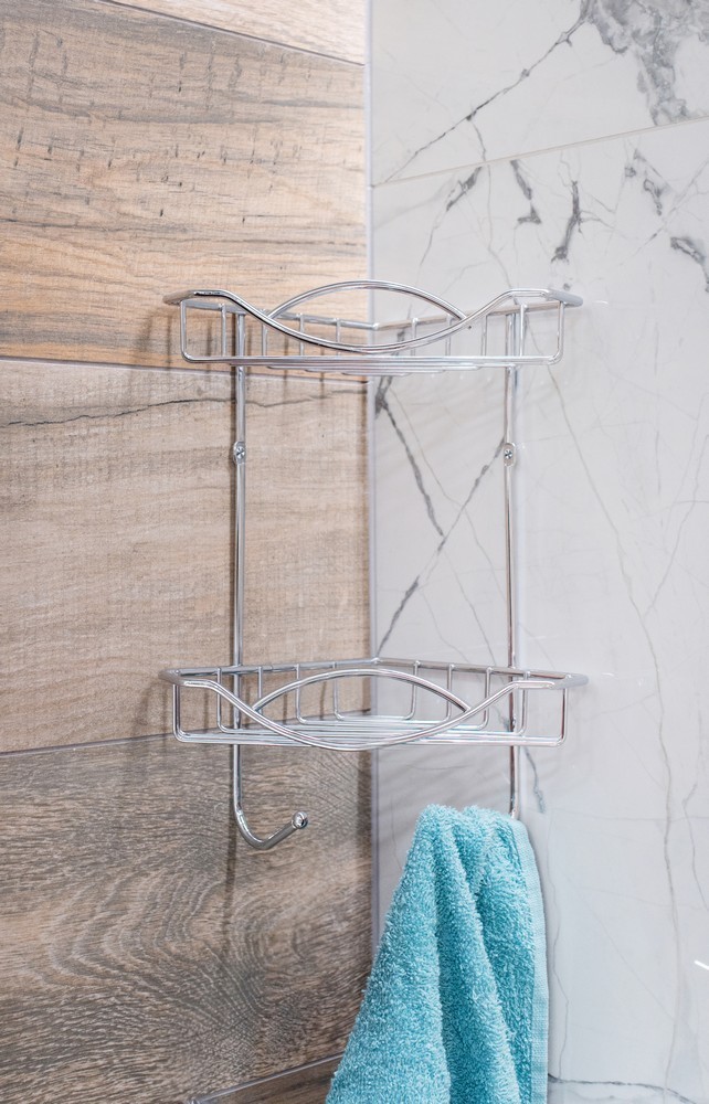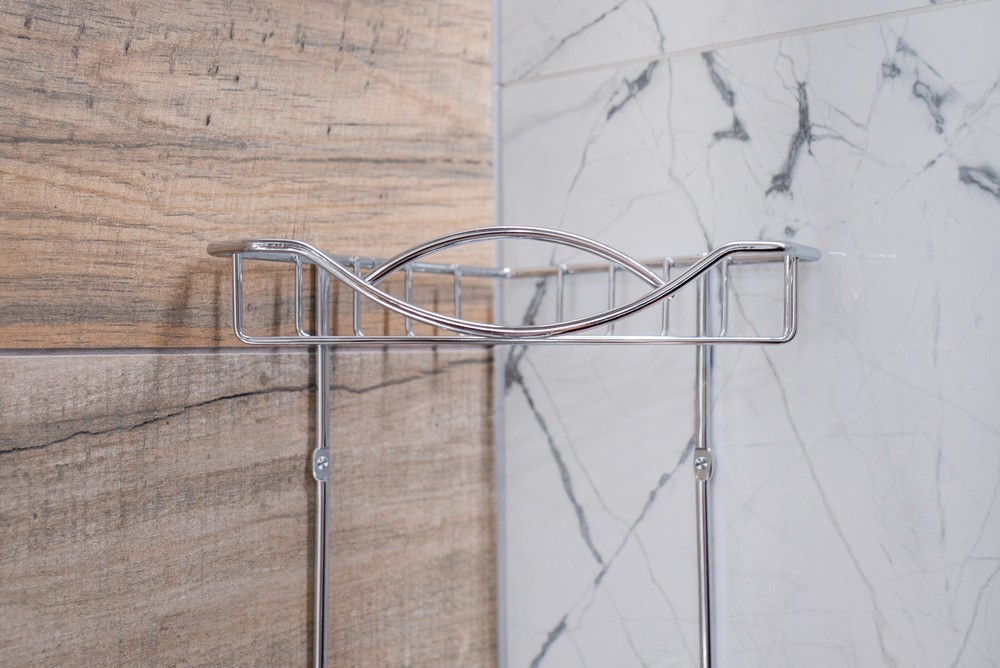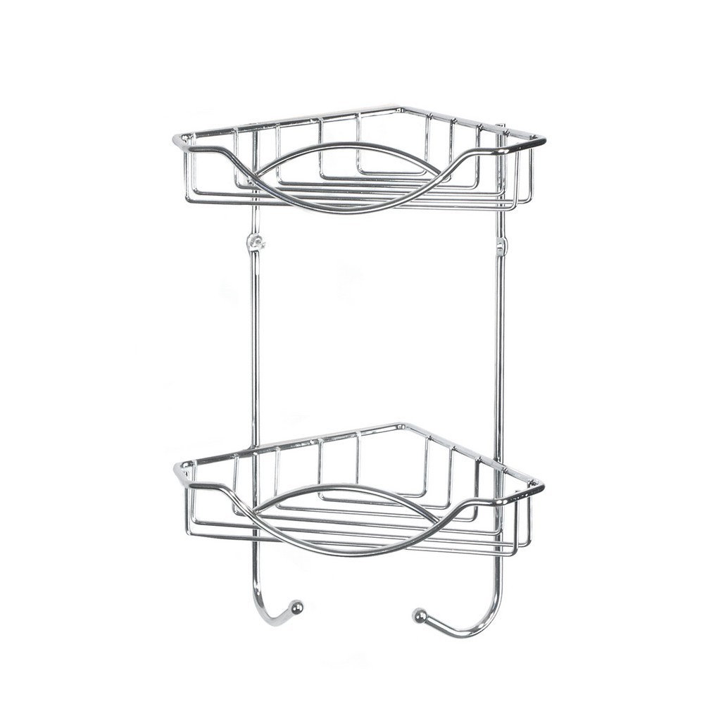 Dvojitá kúpeľňová polička s 2 ďalšími háčikmi v spodnej časti. Je vyrobená z chrómovanej ocele. Skrutky a hmoždinky na montáž sú súčasťou sady.