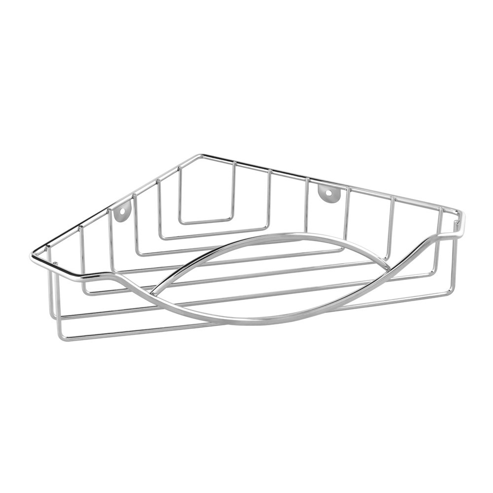 Jednoduchá rohová kúpeľňová polička z chrómovaného drôtu.