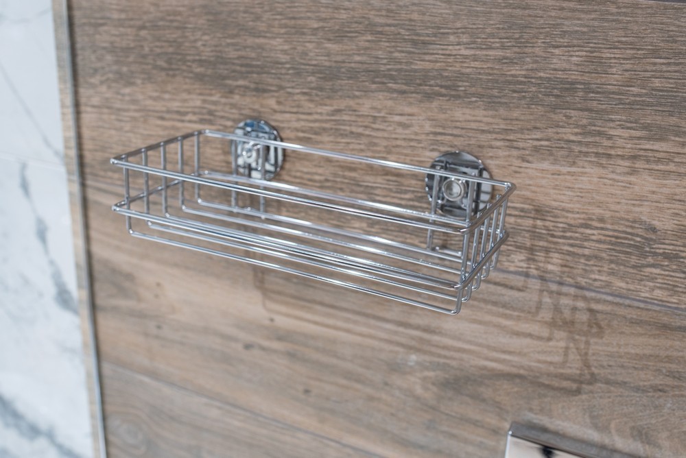 Drôtená kúpeľňová polička pripevnená lepiacou páskou 3M. Maximálna nosnosť do 4 kg.