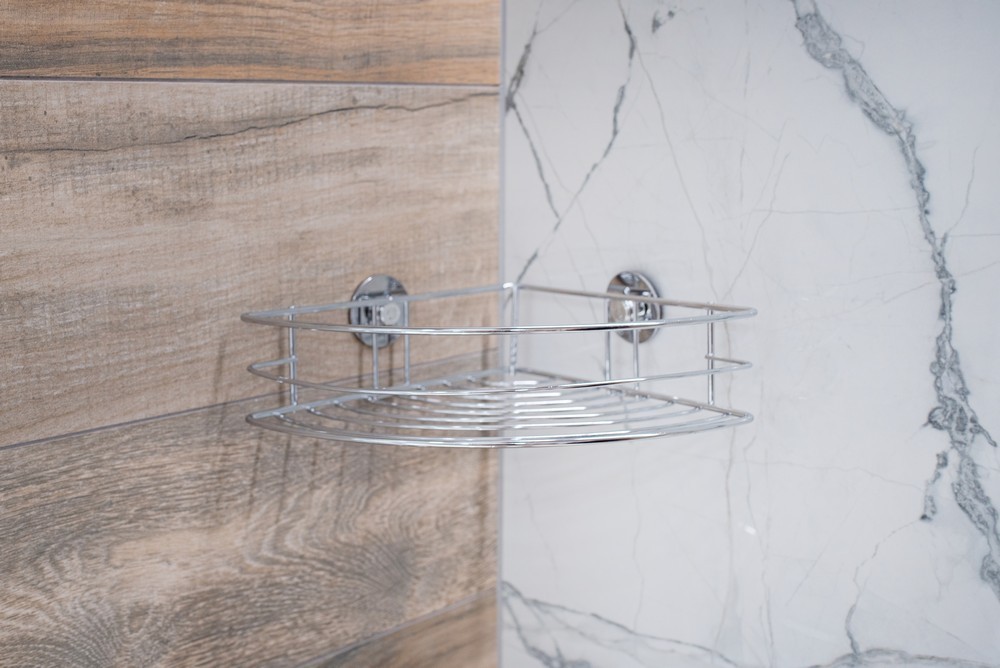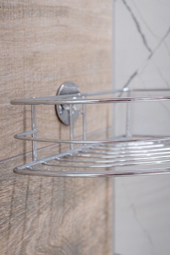 Kúpeľňová polička rohová z chrómovanej ocele. Ľahko sa inštaluje pomocou odolnej pásky. Jeho nosnosť je až 4 kilogramy.