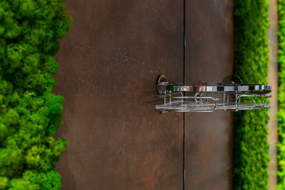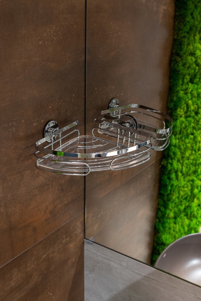 Kúpeľňová polička rohová. Je vyrobená z pochrómovaného kovu a plastu, ktorý tvorí základ poličky, ktorý zabraňuje vypadávaniu menších kúpeľňových doplnkov. Inštalácia prebieha na samolepiacu 3M pásku. Rohová polica má maximálnu nosnosť 4 kg.