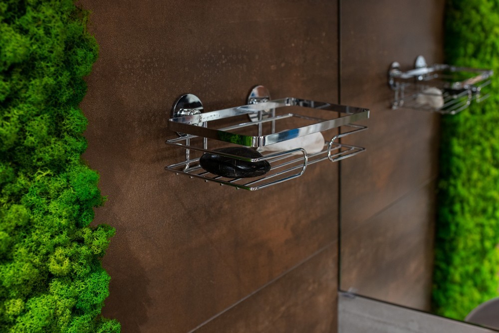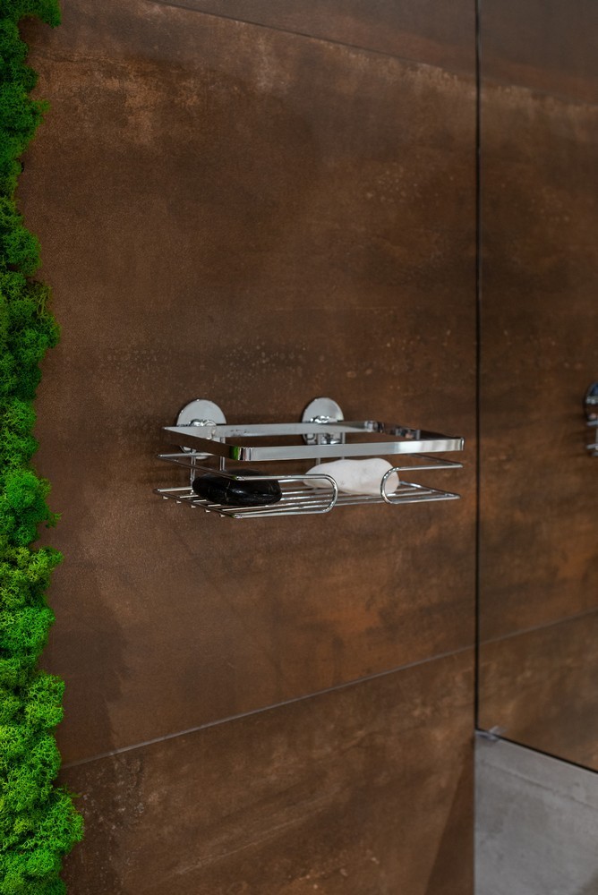 Praktická polička do kúpeľne. Je vyrobená z pochrómovaného kovu. Vnútri police je stojan z priehľadného plastu. Inštalácia sa vykonáva pomocou samolepiacej 3M pásky. Maximálne zaťaženie kúpeľňovej police je až 4 kg.