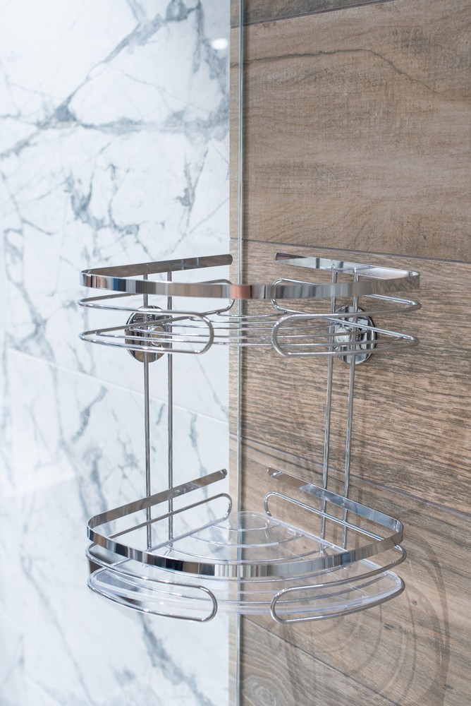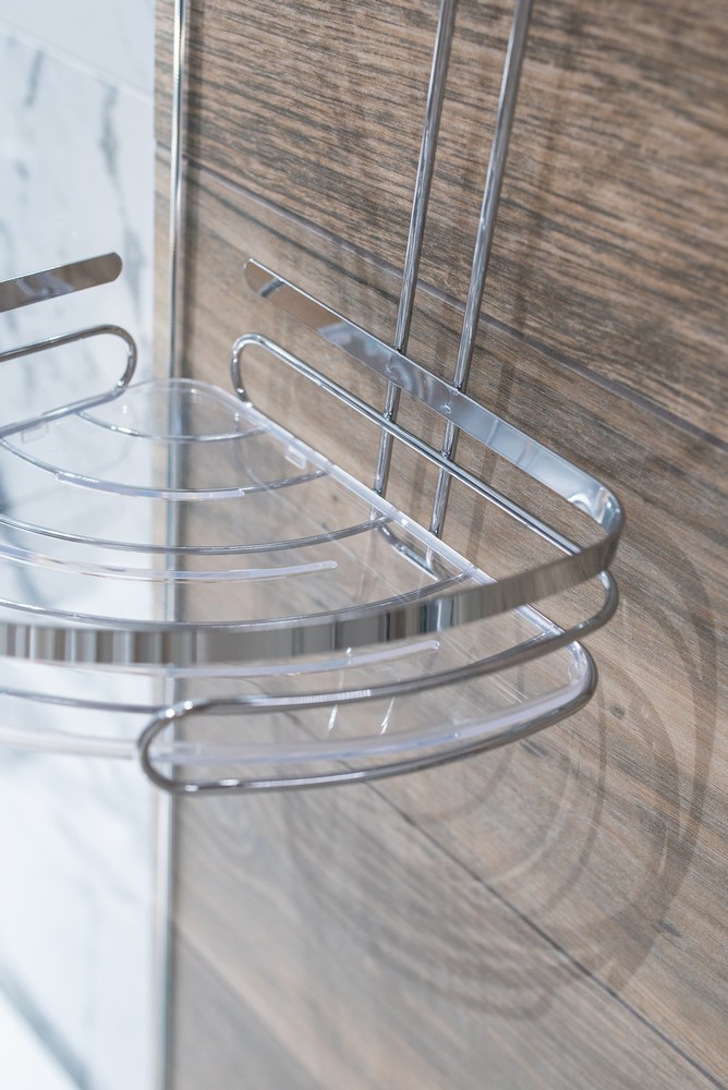 Dvojdielna kúpeľňová polica. Je vyrobená z chrómovaného kovu a plastu. Inštalácia sa vykonáva pomocou samolepiacej 3M pásky. Maximálna nosnosť police je až 4 kg.