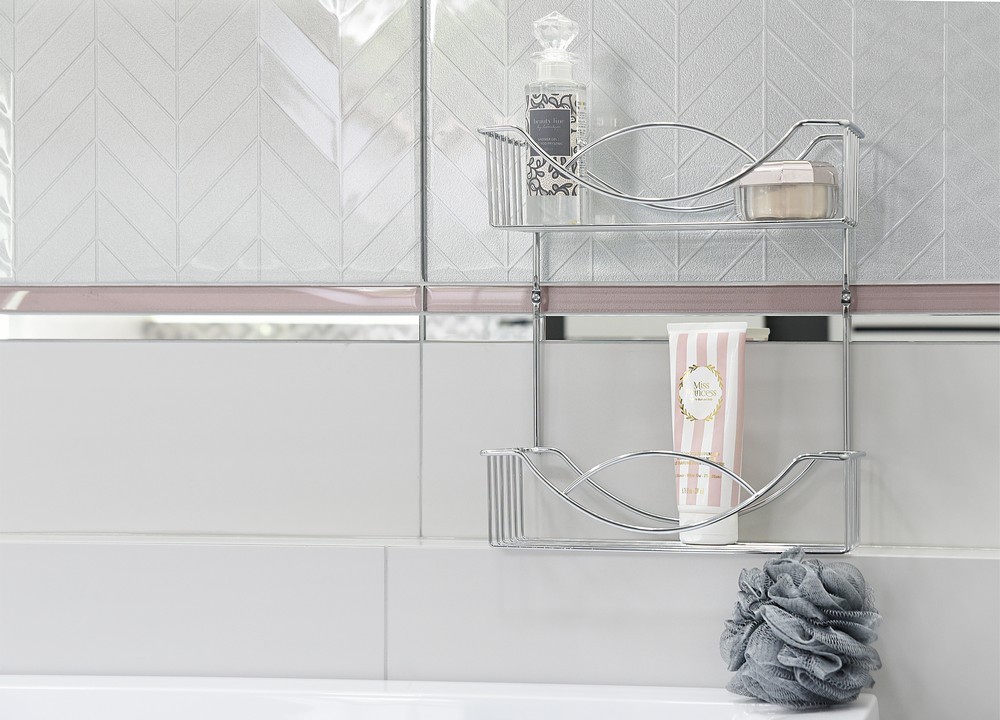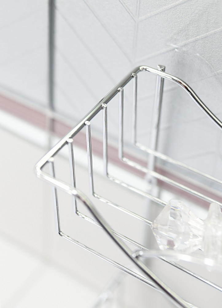 Kúpeľňová drôtená polička na odkladanie drobností. Sprchová polica má dve úrovne. Skrutky a hmoždinky na montáž sú súčasťou sady.
