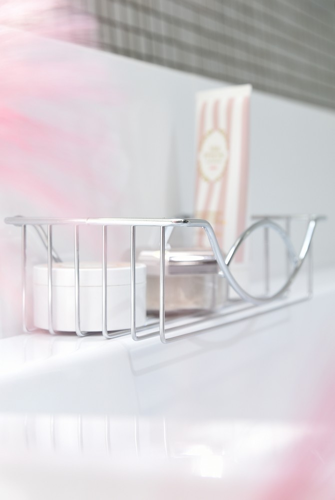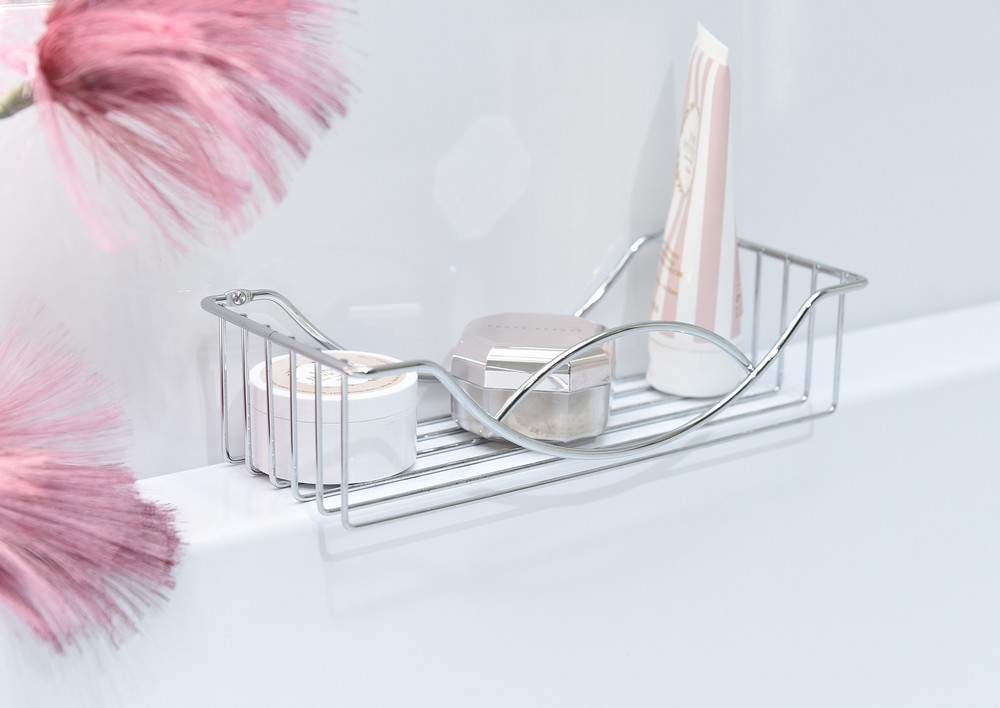 Kúpeľňová polica z chrómovaného kovu. Montáž sa vykonáva pomocou skrutiek a hmoždiniek, ktoré sú súčasťou sady.