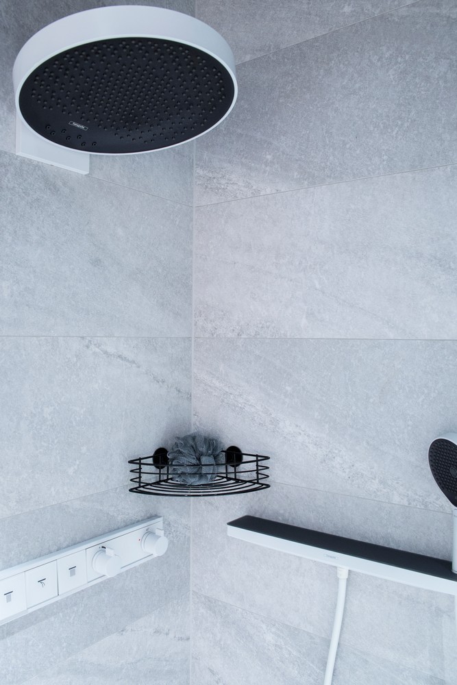 Kúpeľňová alebo sprchová polička vyrobená z lesklej čiernej lakovanej ocele. Inštalácia kúpeľňovej police nevyžaduje vŕtanie, namontovaná na 3M páske s vysokou priľnavosťou. Rohová kúpeľňová polička umožňuje ušetriť miesto montáží do rohu.