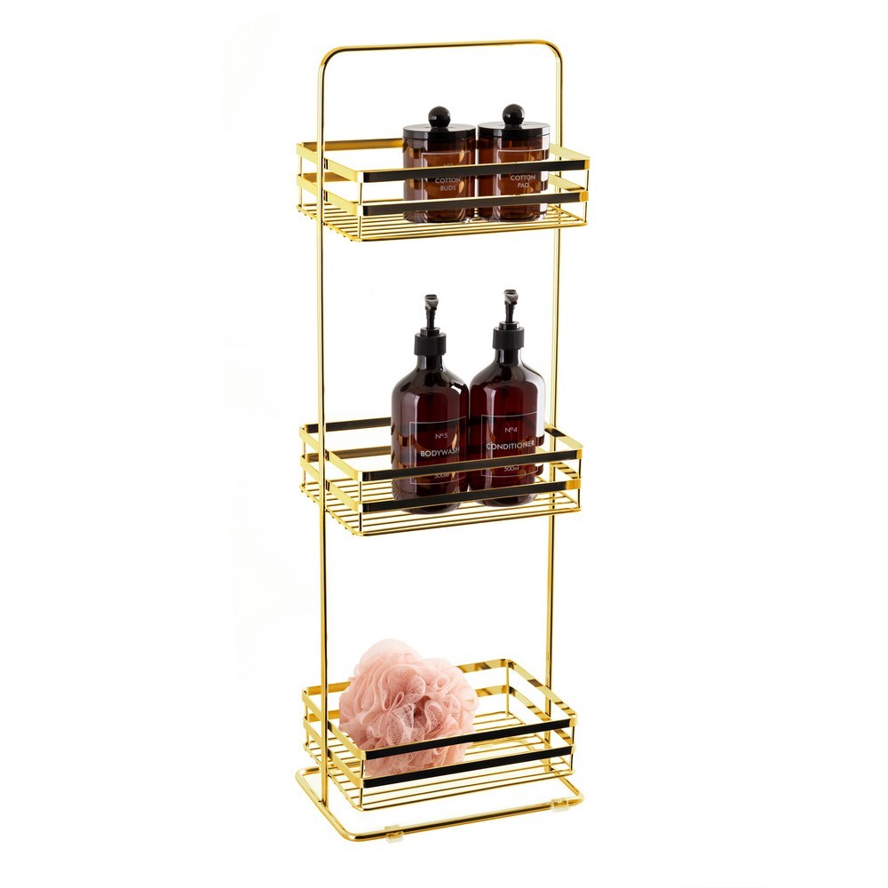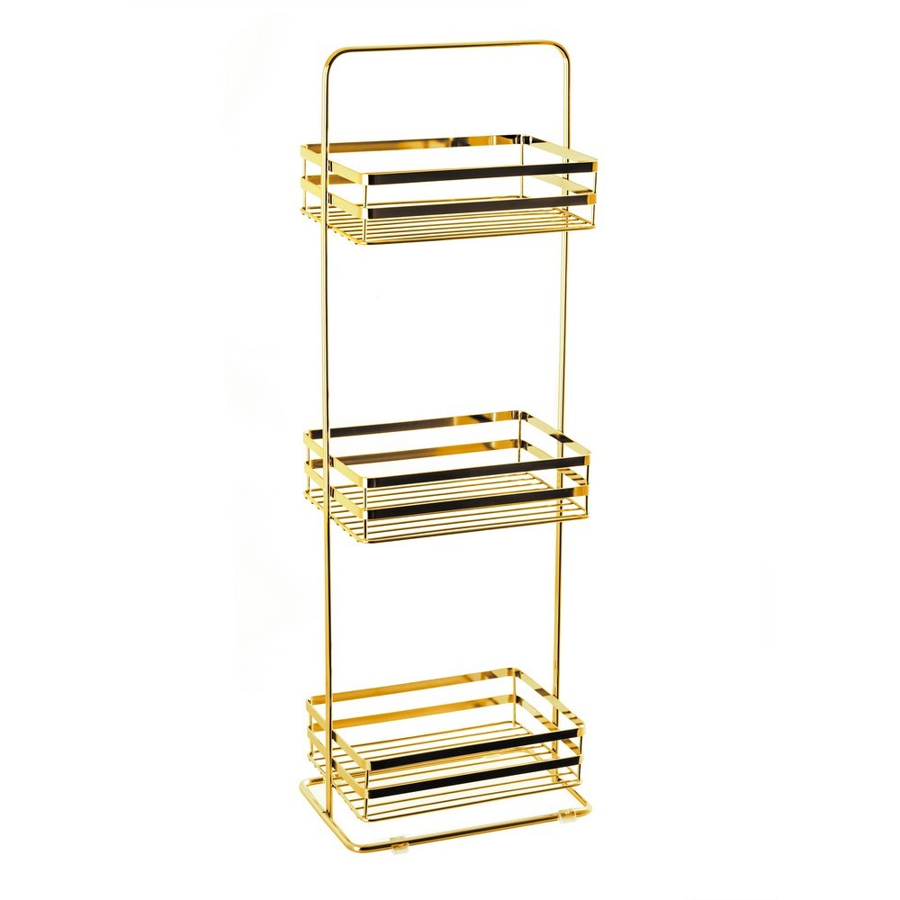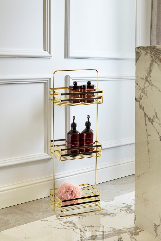 Popis: Elegantná oceľová polica AWD INTERIOR je dokonalou kombináciou štýlu a funkčnosti. Vyrobené z ocele s lesklou zlatou povrchovou úpravou, dokonale sa hodí do moderných interiérov a dodáva mu trendy. Tri priestranné police poskytujú dostatok úložného priestoru pri zachovaní kompaktných rozmerov, vďaka čomu je ideálny do kúpeľne, kuchyne alebo predsiene. Drôtená konštrukcia mu dodáva ľahký vzhľad, zatiaľ čo plastové nožičky chránia podlahu pred poškriabaním. Jeho ľahká, prenosná konštrukcia umožňuje ľahké premiestnenie podľa vašich potrieb.