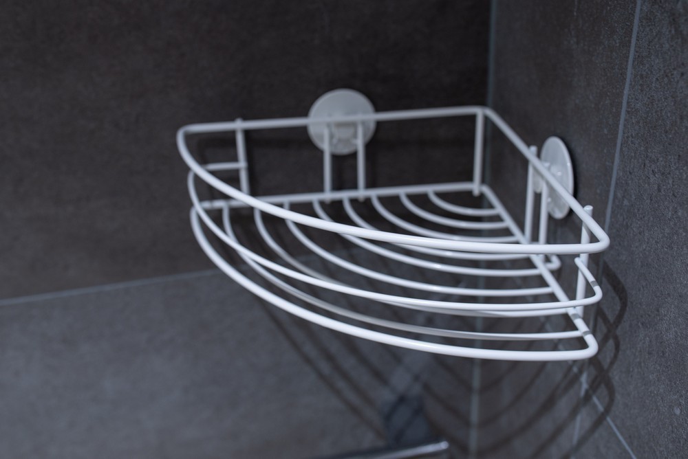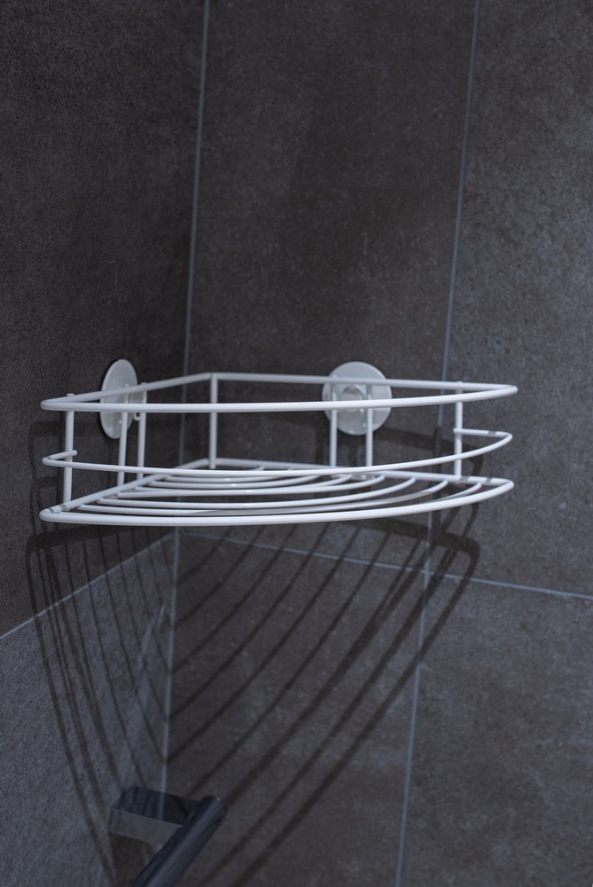 Rohová drôtená polica z bielo lakovanej ocele. Pripevnené 3M samolepiacou páskou. Jeho maximálna nosnosť je 4 kg.