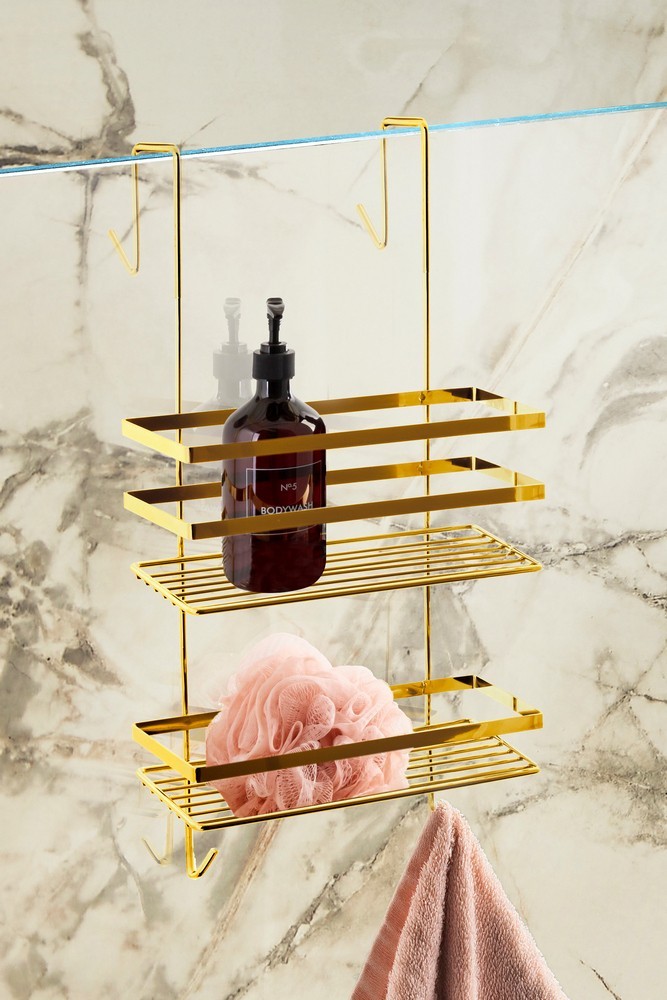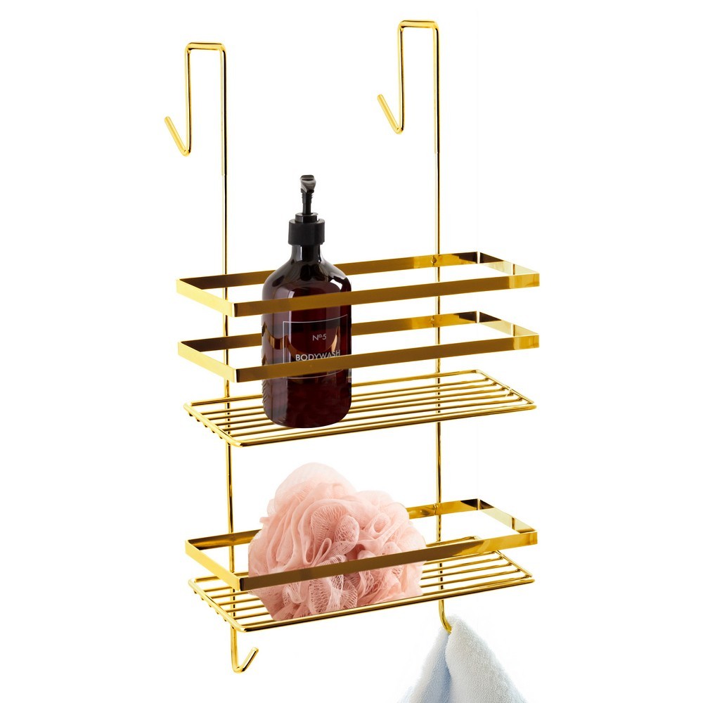 Popis: Štýlová sprchová polička AWD INTERIOR v zlatej farbe je perfektným riešením do kúpeľní, kde záleží na praktickosti aj dizajne. Je vyrobená z ocele potiahnutej zlatom a ponúka dve priestranné police na toaletné potreby a ďalšie háčiky - dve na štetce alebo huby a dve na uteráky. Vďaka mäkko potiahnutým vešiakom chráni polička hrany sprchovej kabíny alebo vaňovej zásteny pred poškriabaním. Tento elegantný a trendy doplnok je dokonalým doplnkom každej kúpeľne a dodáva jej triedu a pohodlie.