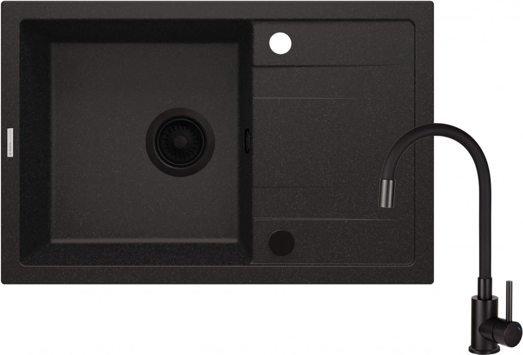 Granitový drez s batériou tvorí kompletnú zostavu do kuchyne. Je vyrobená z odolnej prírodnej žuly, ktorá odoláva nielen vysokým teplotám a ich kolísaniu, ale aj nárazom a zafarbeniu, v súlade s európskou normou PN-EN 13310. Navyše je obohatená o hydrofóbnu vrstvu, uľahčujúcu tok jednotlivých kvapiek. V rovnakých farbách nechýbajú ani vodovodné batérie s pohodlným výtokom. Praktický jednomiskový drez s odkvapkávačom je perfektným riešením pre malé kuchyne a štúdiové apartmány s kuchynským kútom. Funguje aj ako sušička, profilovaný povrch účinne odvádza vodu stekajúcu z riadu alebo umytého jedla.