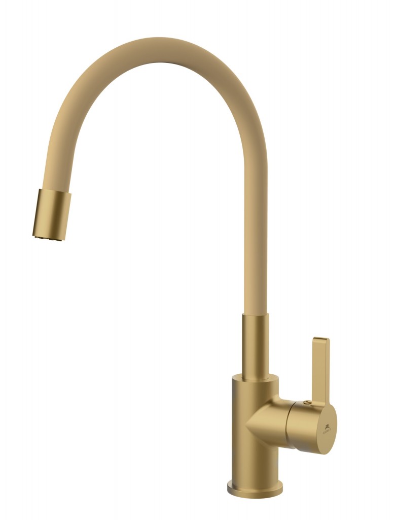 Drezová vodovodná batéria FLEXY-33 NEW v zlatej farbe s flexibilnou (ohybnou) hadicou, ktorú ponúkame v piatich farebných variantoch (biela, čierna, čierna/chróm, zlatá a tmavo šedá). FLEXY-33 NEW v mnohom prekračuje strednú kategóriu, do ktorej sa radí svojou priaznivou cenou. Batéria je moderne designovaná.