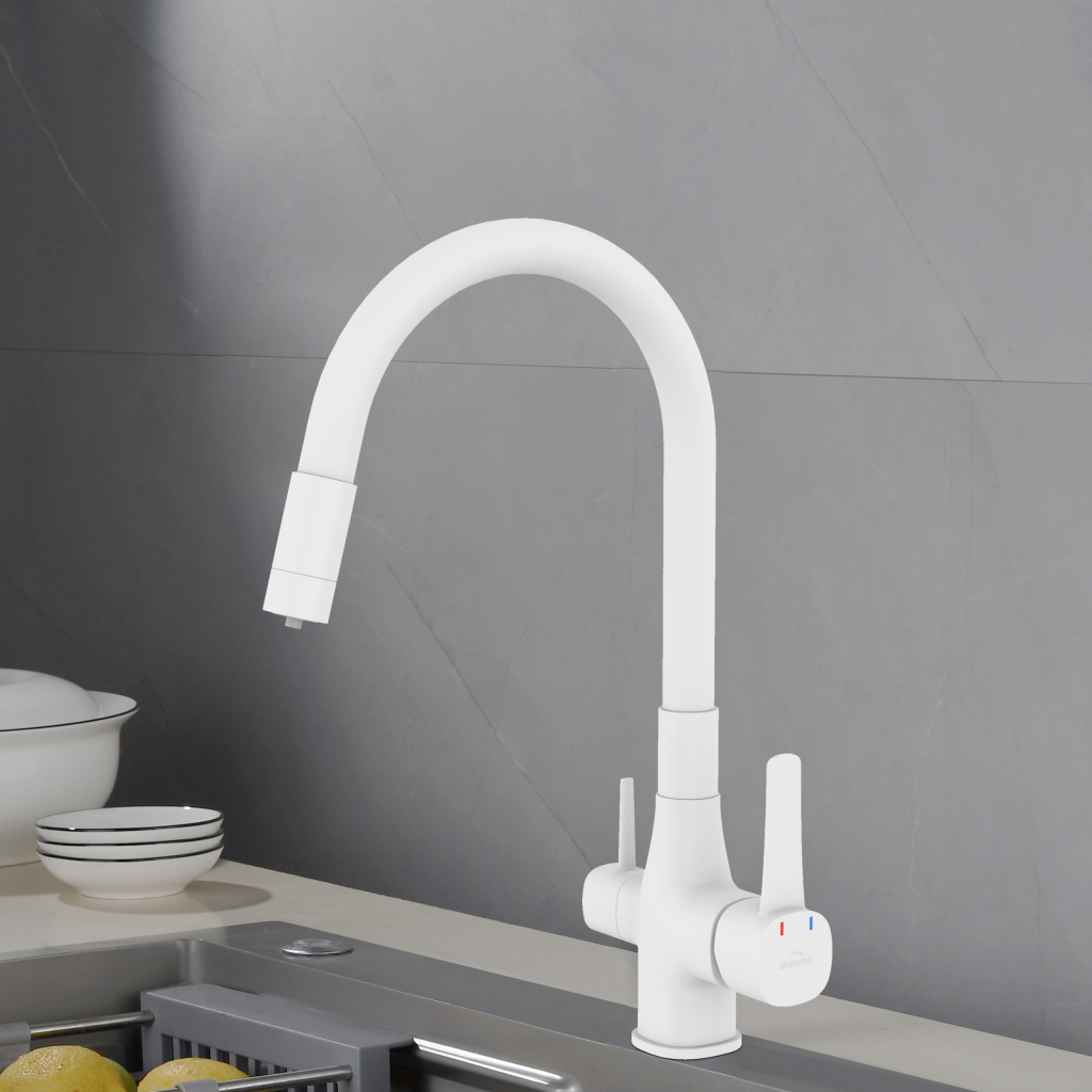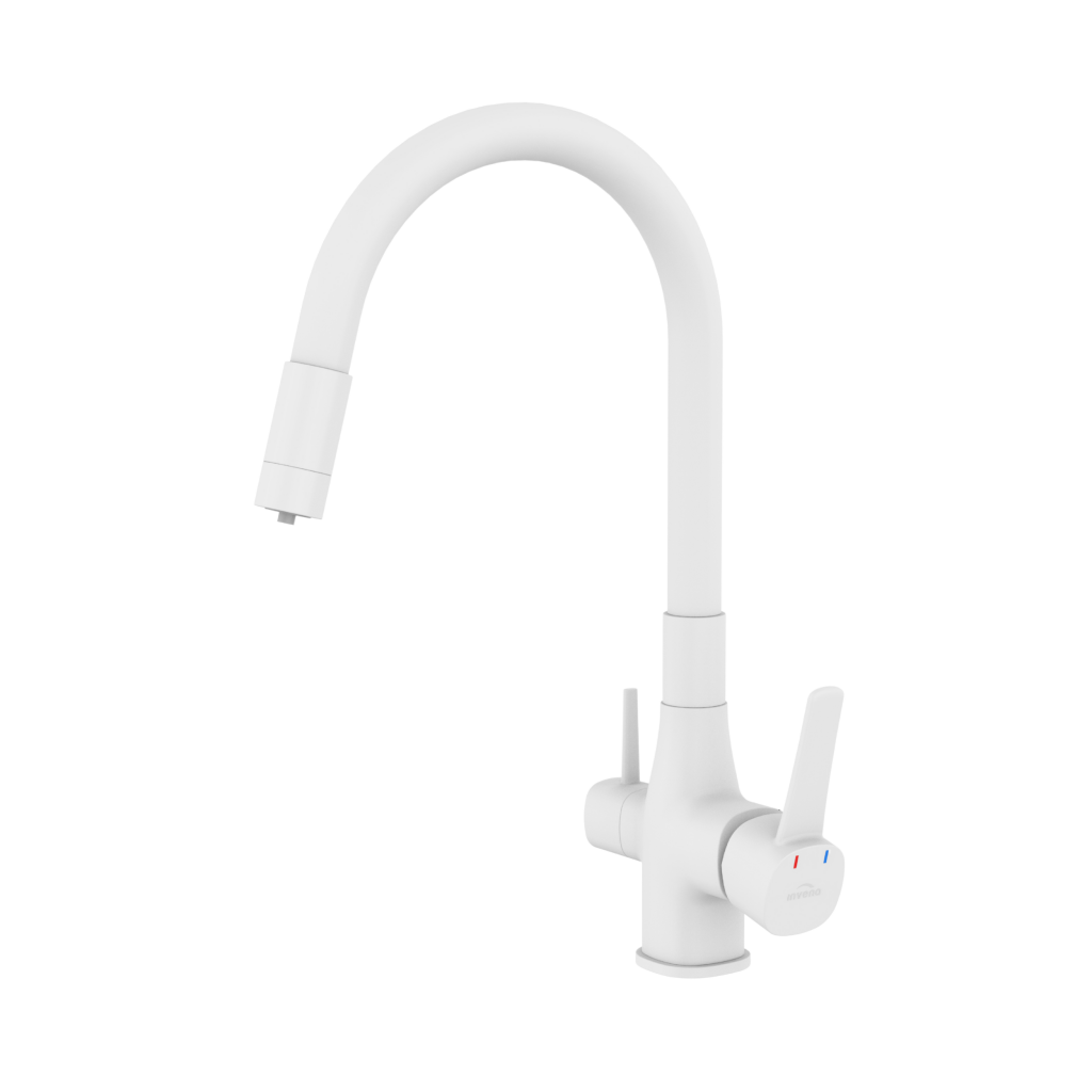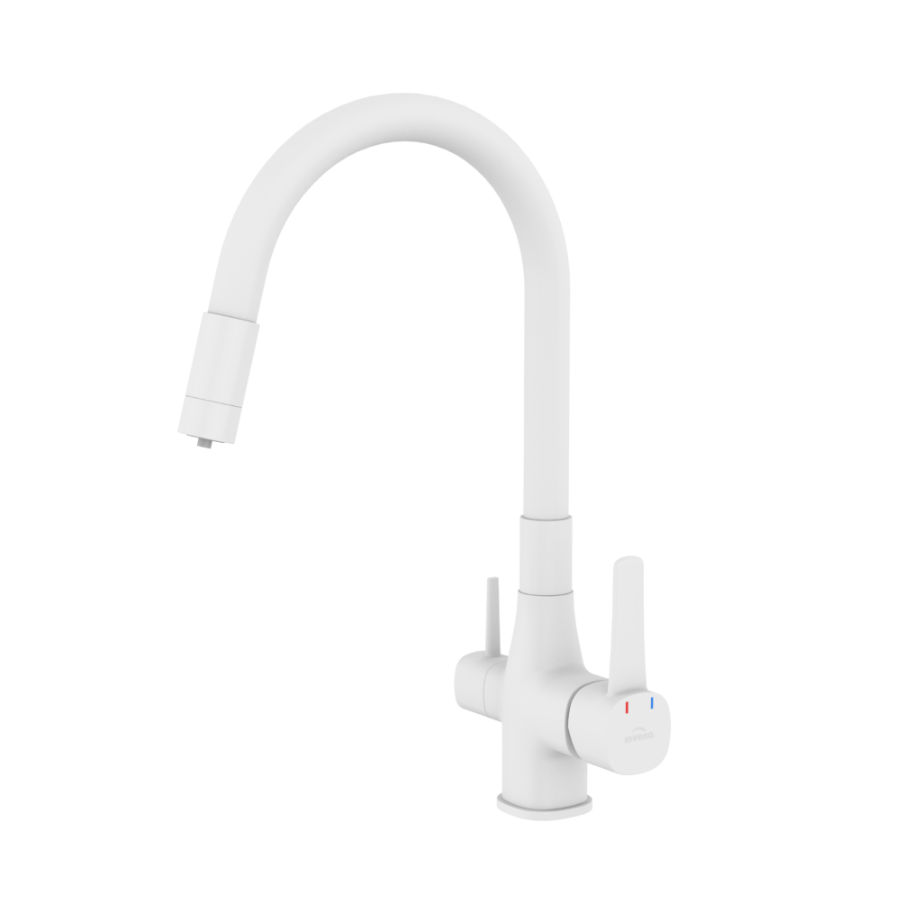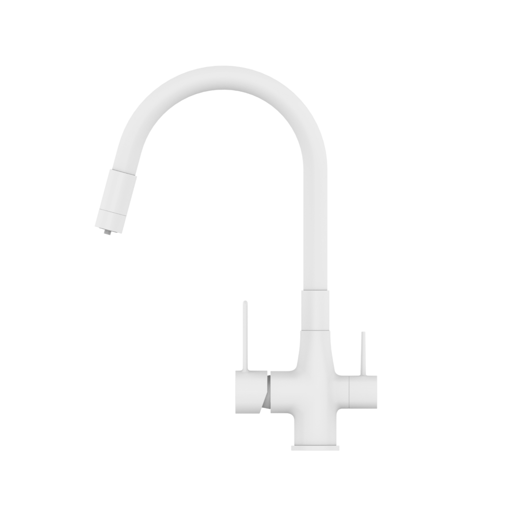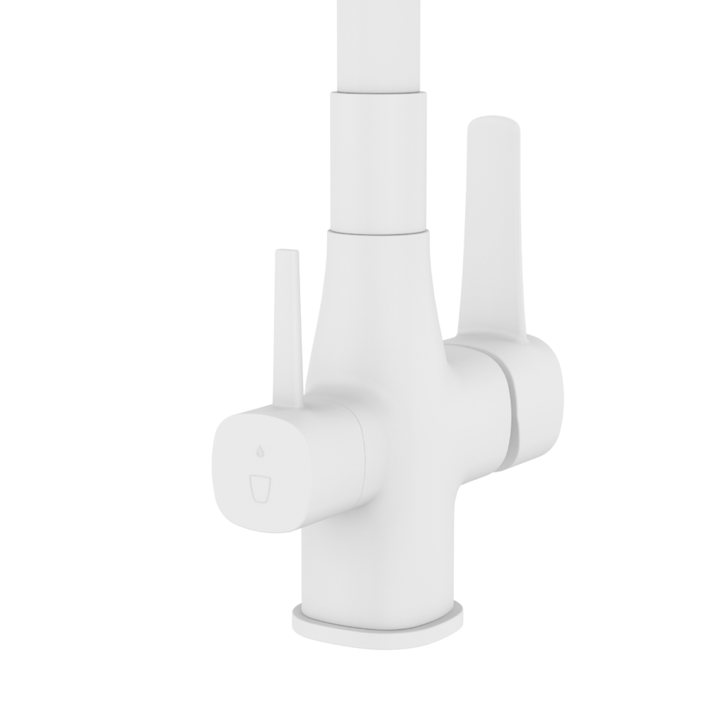 Batéria je vybavená dvoma samostatnými rukoväťami – jedna na bežnú vodu, druhá na filtrovanú – čo šetrí filter a zaisťuje maximálny komfort pri každodennom používaní. Flexibilný výtok zvyšuje dosah a pohodlie pri práci v dreze.