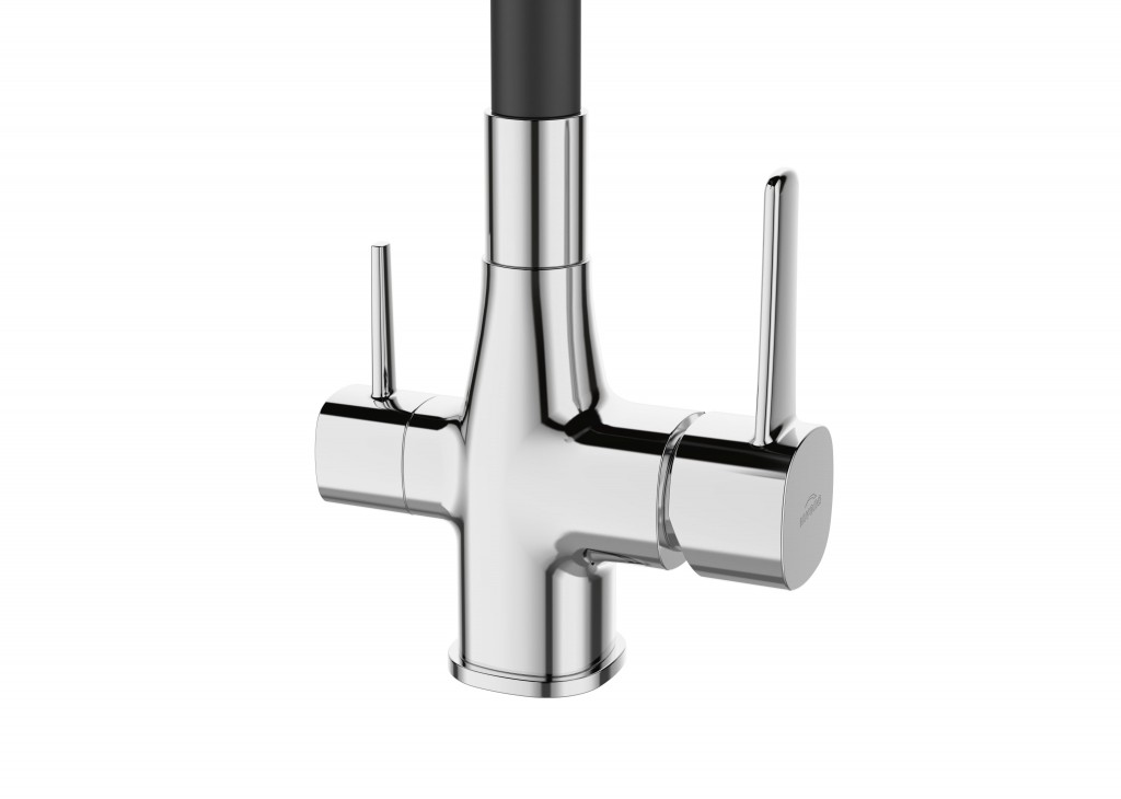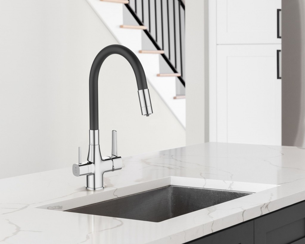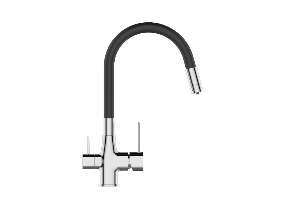 Batéria je vybavená dvoma samostatnými rukoväťami – jedna na bežnú vodu, druhá na filtrovanú – čo šetrí filter a zaisťuje maximálny komfort pri každodennom používaní. Flexibilný výtok zvyšuje dosah a pohodlie pri práci v dreze.