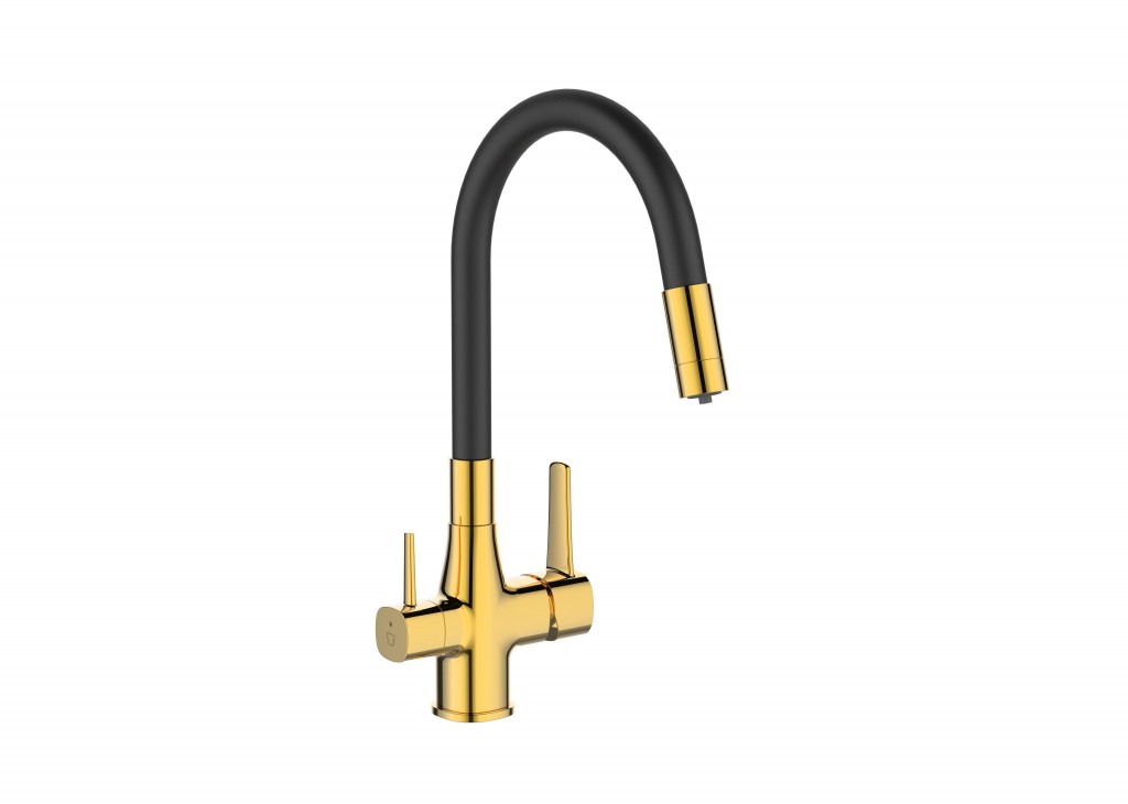 Batéria je vybavená dvoma samostatnými rukoväťami – jedna na bežnú vodu, druhá na filtrovanú – čo šetrí filter a zaisťuje maximálny komfort pri každodennom používaní. Flexibilný výtok zvyšuje dosah a pohodlie pri práci v dreze.