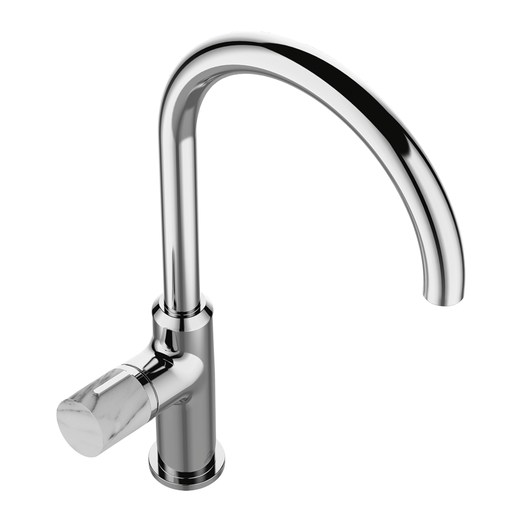 Drezová batéria Stone Plus v klasickom chróme je vybavená rukoväťou s mramorovým efektom, pokračovaním série, ktorá vám umožní zariadiť všetky miestnosti v jednom konzistentnom štýle. Táto kombinácia vytvorí zaujímavý vizuálny efekt a umožní vám vniesť elegantný charakter do interiéru kuchyne. Otočný výtok použitý pri kuchynskej batérii Stone Plus zaisťuje jej plnú funkčnosť. Vďaka úspornému perlátoru je to perfektné riešenie pre ľudí, ktorým záleží na svete okolo nás.