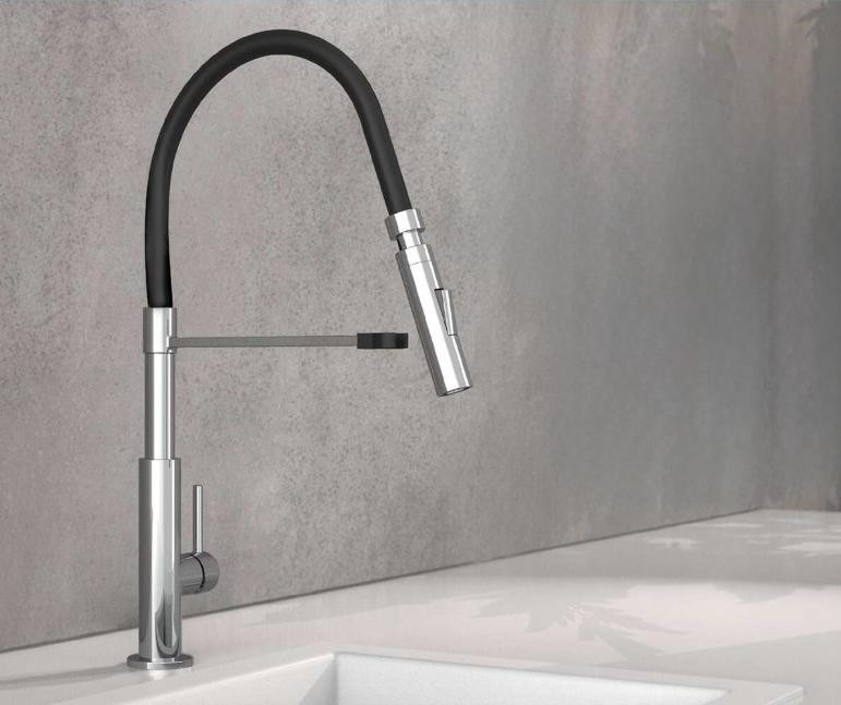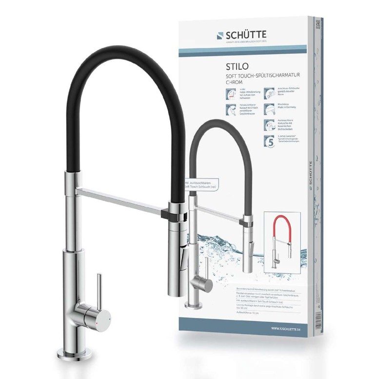 Moderná kuchynská batéria STILO v elegantnom chróm/čiernom prevedení kombinuje štýlový dizajn, komfortné používanie a vysokú funkčnosť. Vďaka hadici Soft Touch , ktorá je súčasťou batérie a vymeniteľná, ponúka maximálnu flexibilitu pri oplachovaní riadu aj plnení hrncov.