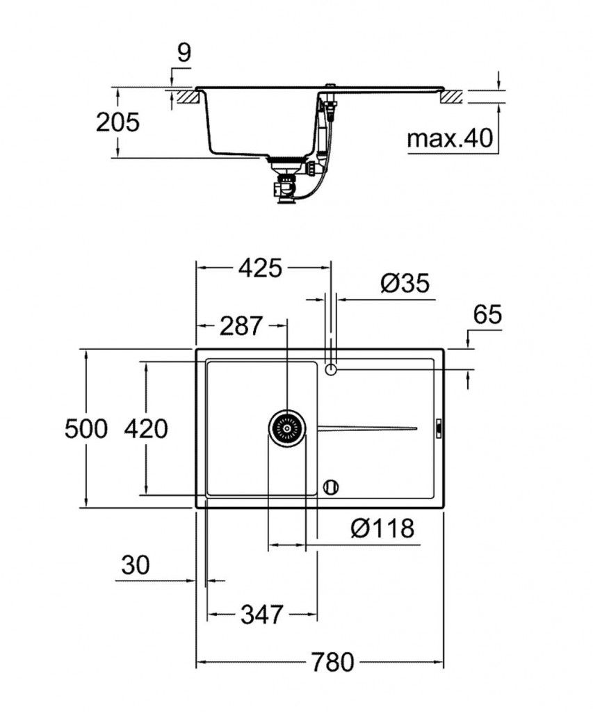 - veľkosť sektora drezu: 347 x 440 x 205 mm